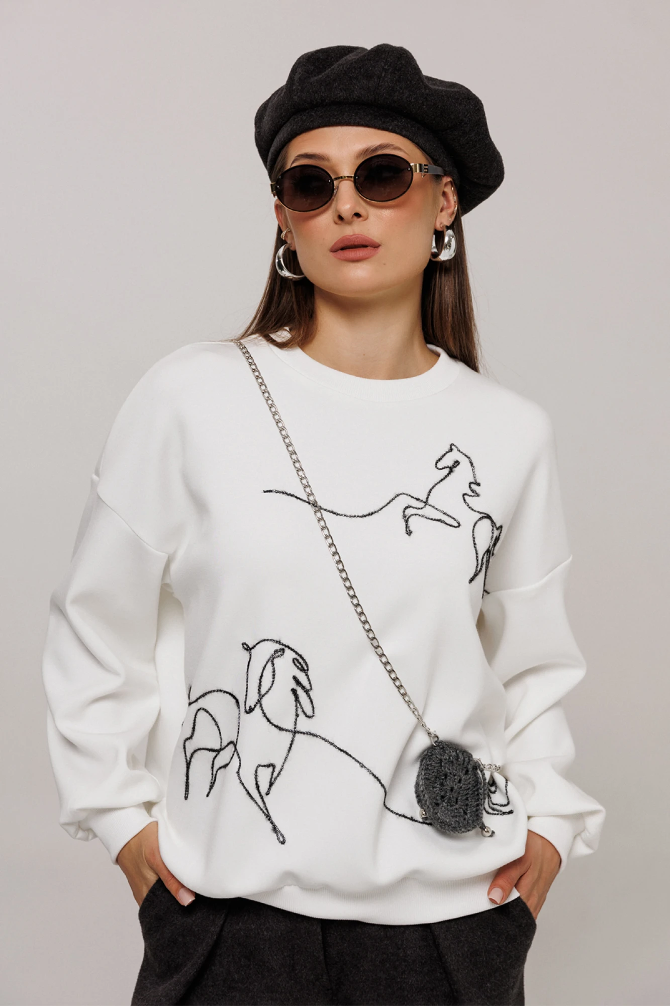 Джемпер из технологичного трикотажного полотна с эффектом peach. Прямого силуэта с втачным рукавом и спущенной линией плеча, с манжетой из отделочной ткани по низу рукава. По переду вышивка декоративным шнуром "Кони". По горловине и низу изделия притачная планка из отделочной ткани.