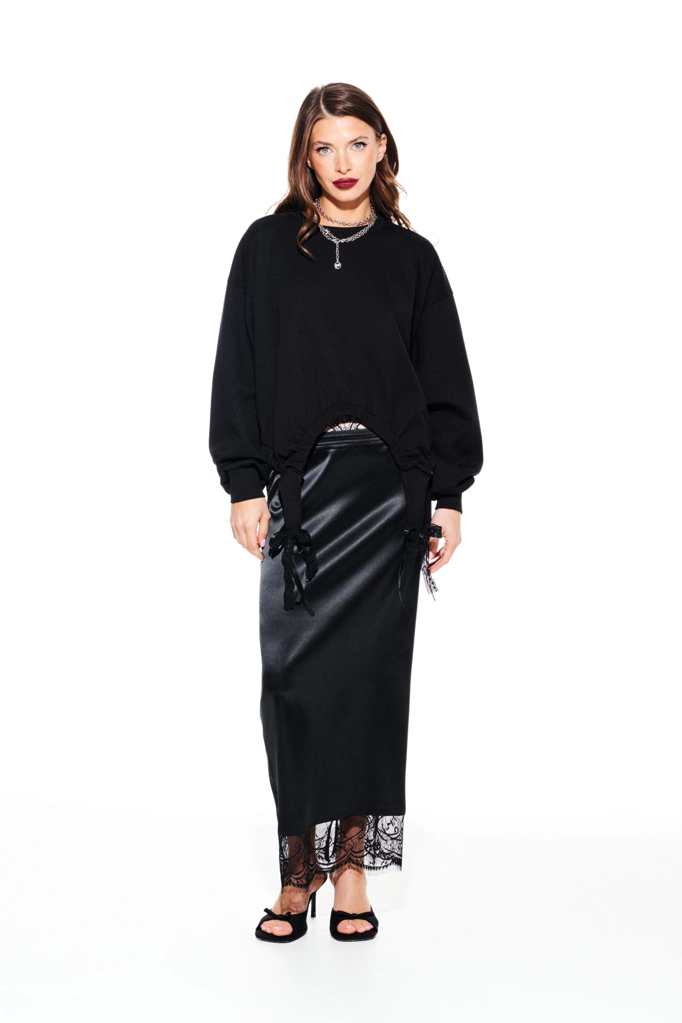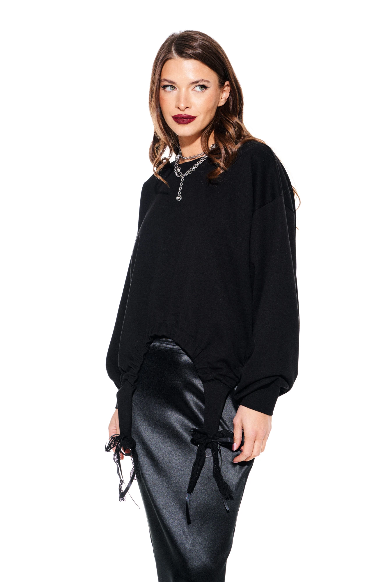 Свитшот из трикотажного полотна, свободного объема, прямого силуэта, с круглым вырезом горловины. Перед с фигурной линией низа со сборкой на резинку, декоративными полукольцами и тесьмой из кружева и атласа. Спинка со сборкой на резинку по низу изделия. Рукав втачной, длинный. По низу рукава притачные манжеты.