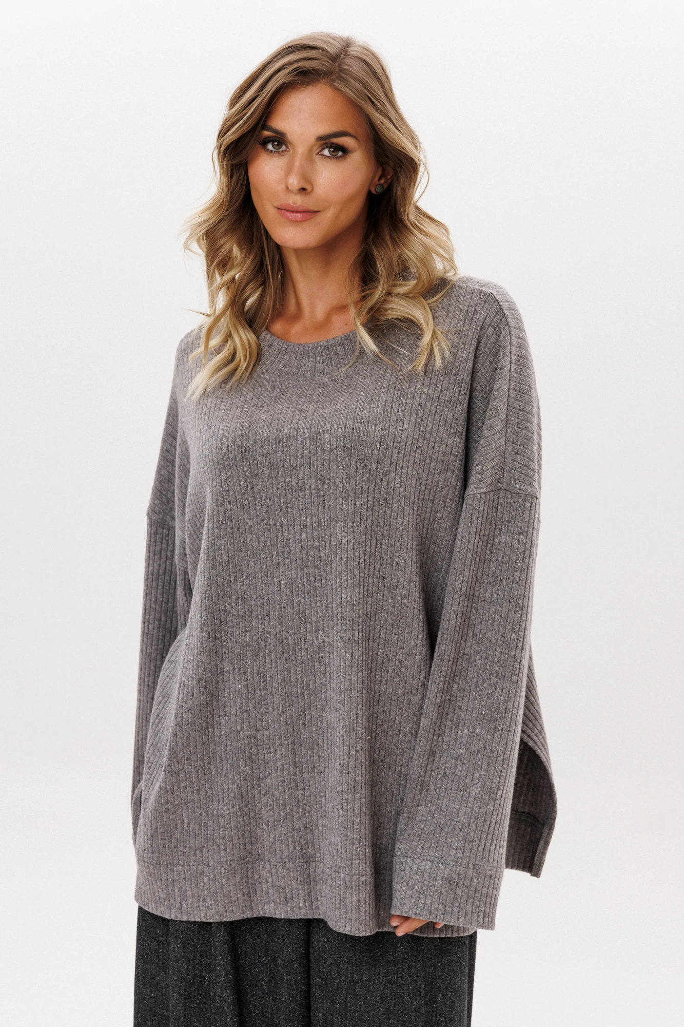 Джемпер выполнен из трикотажного полотна в рубчик. Джемпер прямого силуэта , покроя "oversize" длиной ниже линии бедер. Перед и спинка цельные. Горловина округлой формы, обработана широкой бейкой. Плечевой шов удлинен. Рукав рубашечного покроя, одношовный. В боковых швах разрезы.