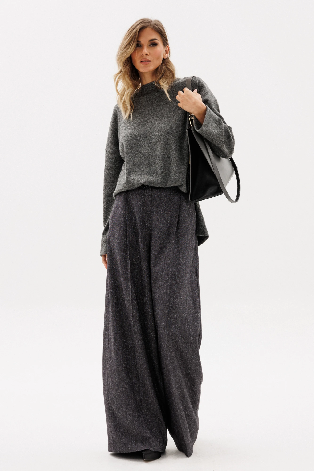 Джемпер выполнен из трикотажного полотна. Джемпер прямого силуэта, длиной ниже линии бедер. Перед и спинка цельные. Горловина округлой формы, обработана широкой бейкой. Плечевой шов удлинен. Рукав рубашечного покроя, одношовный. В боковых швах разрезы.