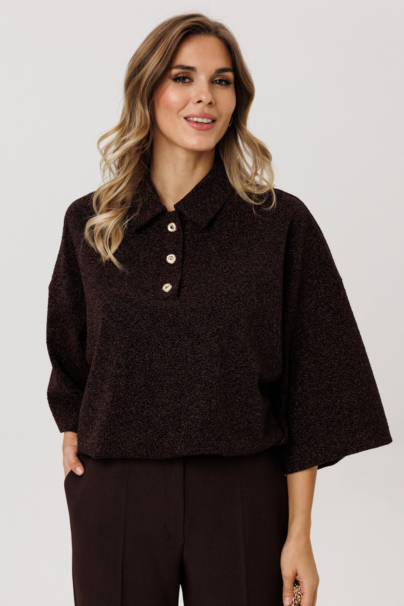 Джемпер выполнен из трикотажного полотна с блеском. Джемпер О-образного силуэта, длиной выше линии бедер. Спереди центральная застежка на декоративные пуговицы. Спинка цельная. Воротник стояче-отложной. Плечевой шов удлинен. Рукав рубашечного покроя, одношовный, длиной до линии локтя. Низ джемпера присобран на эластичную тесьму.