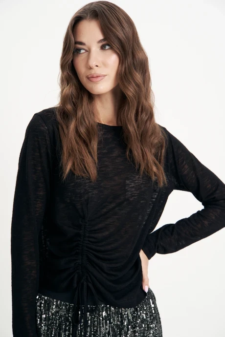 Полуприлегающий силуэт, втачной покрой, круглая горловина, длинный зауженный рукав. По низу джемпера с одной стороны декоративная сборка.