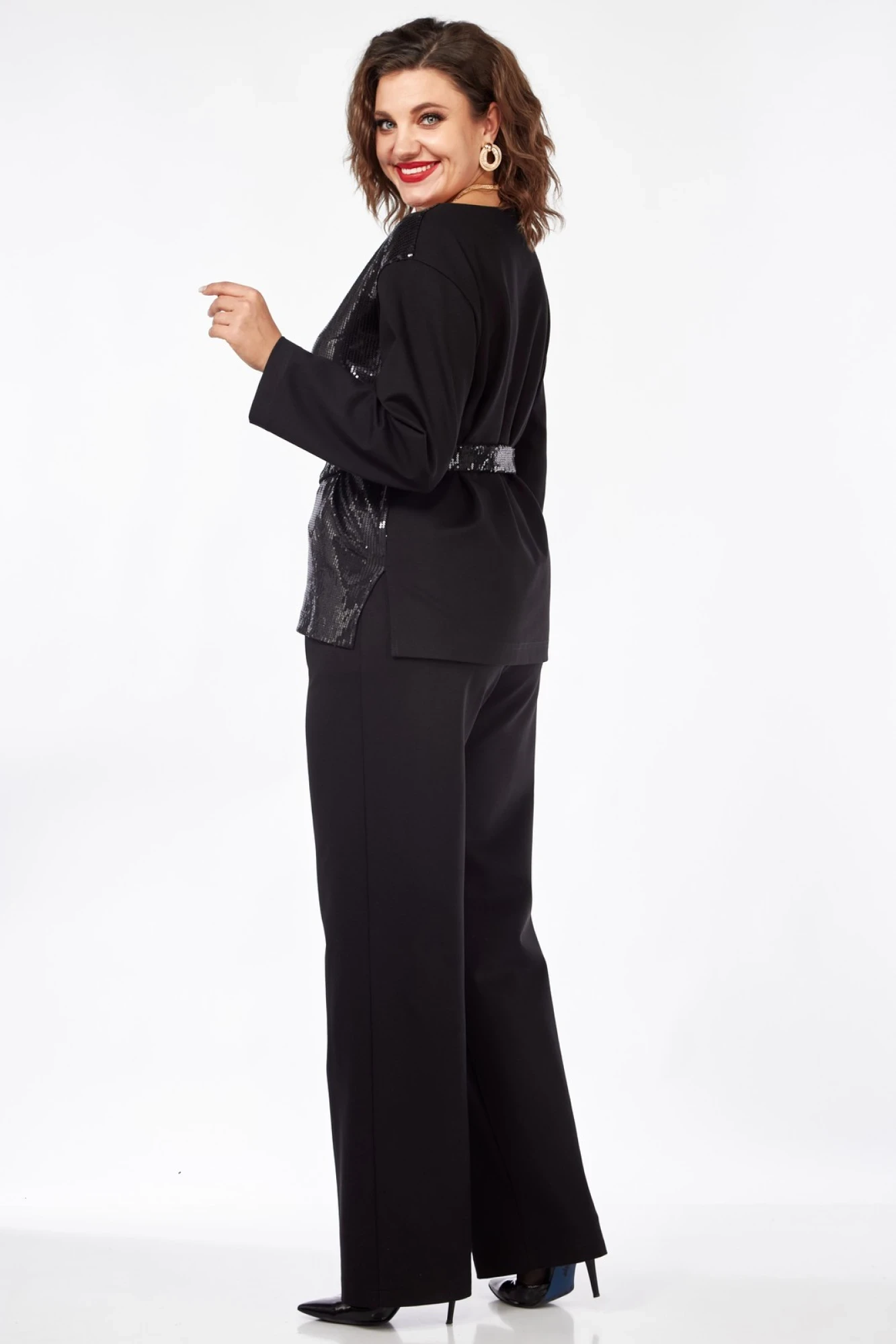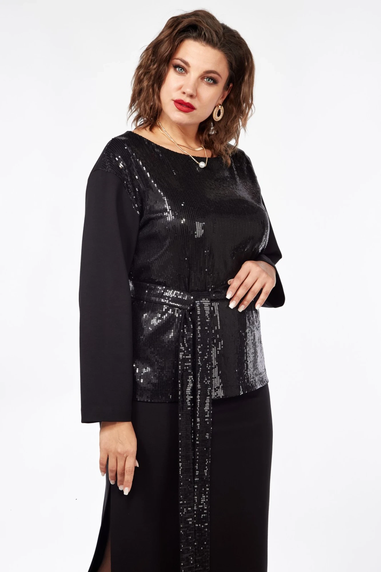 Джемпер прямого свободного силуэта, выполненный из трикотажного полотна и ткани с пайетками, со спущенной линией плеча, вырез горловины «лодочка», по боковым швам – разрезы, высотой 11см. Рукава втачные, прямые. Перед джемпера из ткани в пайетки. Спинка джемпера из трикотажного полотна. В комплекте идет пояс – двухсторонний – одна сторона из ткани с пайетками, другая из трикотажного полотна.