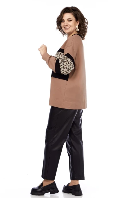Джемпер женский, выполнен путем комбинирования тканей разной расцветки, из трикотажного полотна, свободного силуэта. Горловина округлой формы обработана планкой. Перед и рукава разрезные с декоративными вставками. Спинка цельнокроеная. Рукава спущенные на манжете.
