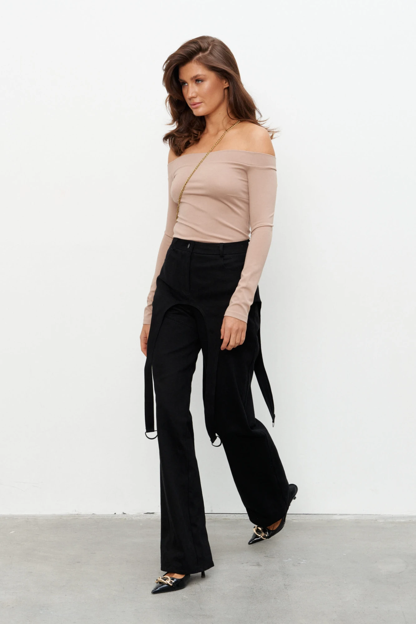 Джемпер из трикотажного полотна прилегающего силуэта с открытыми плечами. Отрезная деталь по верху изделия плотно фиксирует изделие на фигуре.