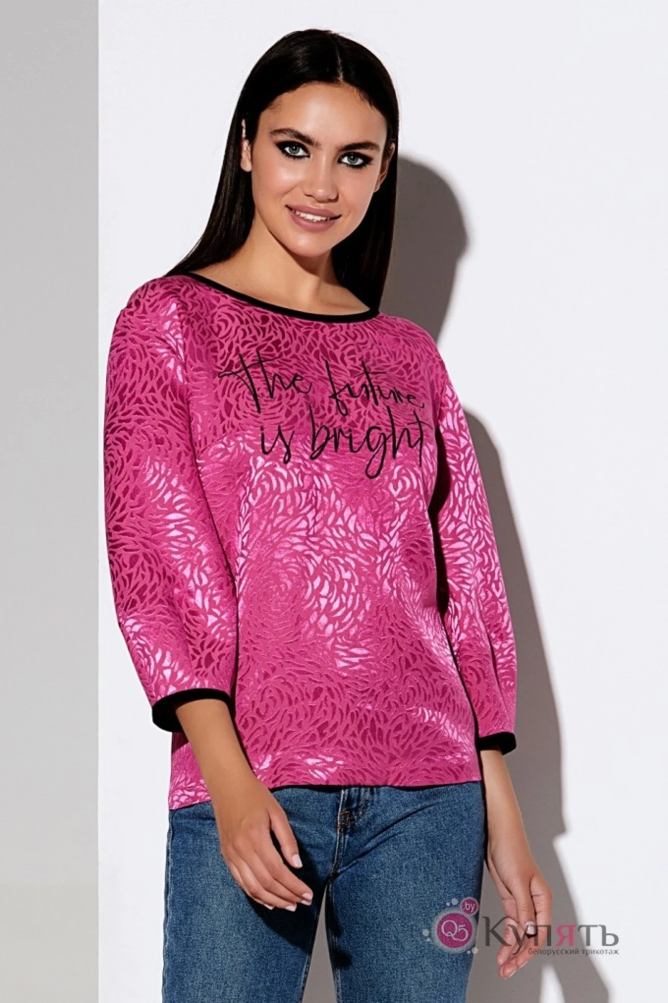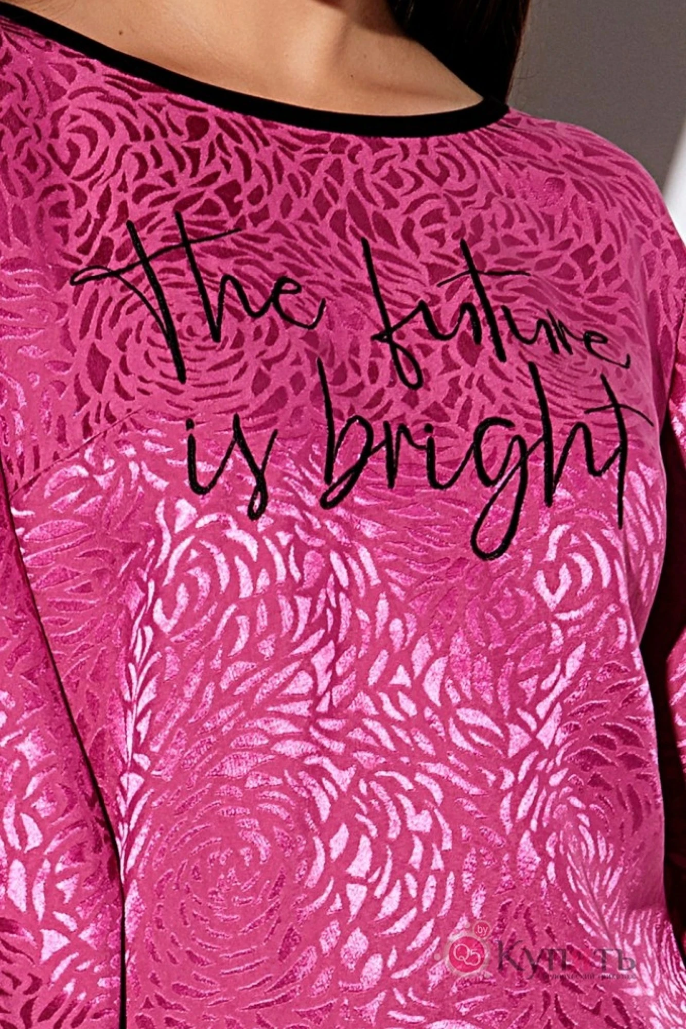 Свитшот прямого силуэта с легким приталиванием выполнен из мягкого жаккарда с авторской вышивкой. Перед с нагрудными вытачками украшен текстовой вышивкой. Вырез горловины ближе к лодке оформлен узкой отрезной бейкой из жоржета. Спигка с V-образным вырезом и завязками. Линия плеча немного приспущена рукава объемные, по низу застрочены вытачки. Низ рукава отработан узкой бейкой как на горловине. Бейки и завязки выполнены из жоржета.