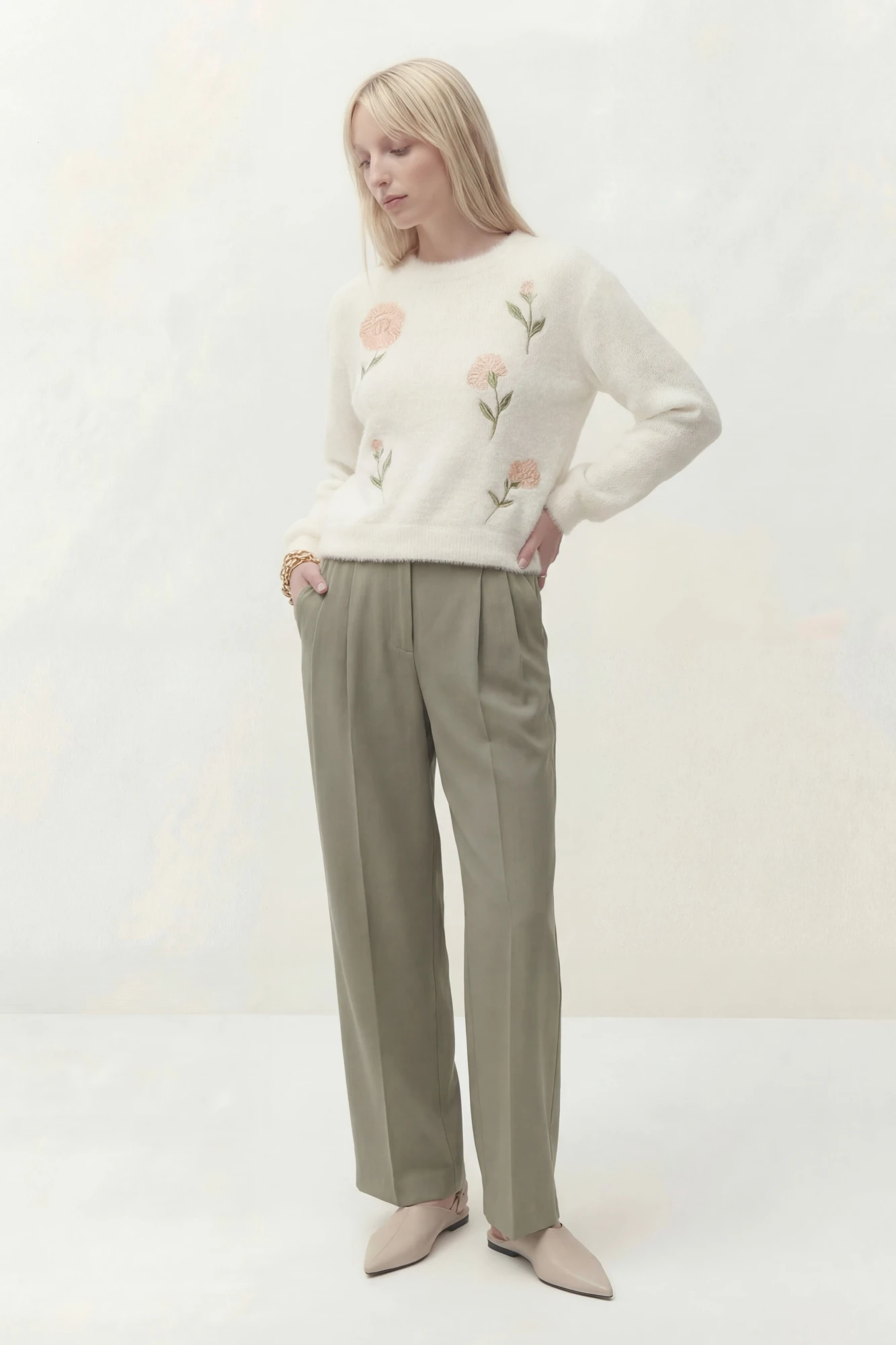 Джемпер свободного кроя, линия плеча спущена. По низу рукава манжета. Округлый вырез горловины с притачной бейкой, по низу джемперы притачная планка. По переду выполнена вышивка.