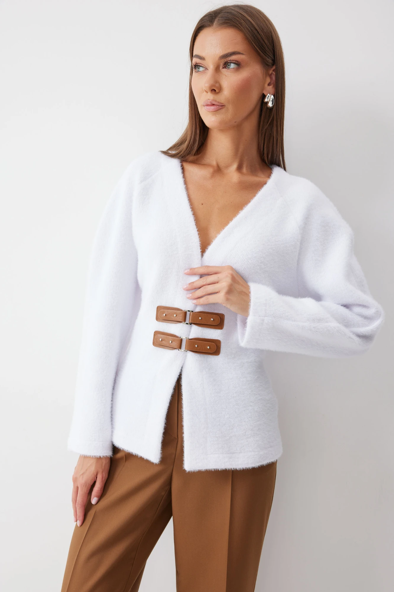 Джемпер полуприлегающего силуэта из трикотажного пушистого полотна. V-образная горловина, рукав реглан. По переду джемпера расположены пряжки. На спинке расположены вытачки, для придания силуэта. Обращаем ваше внимание, что фурнитура может незначительно отличаться от фото