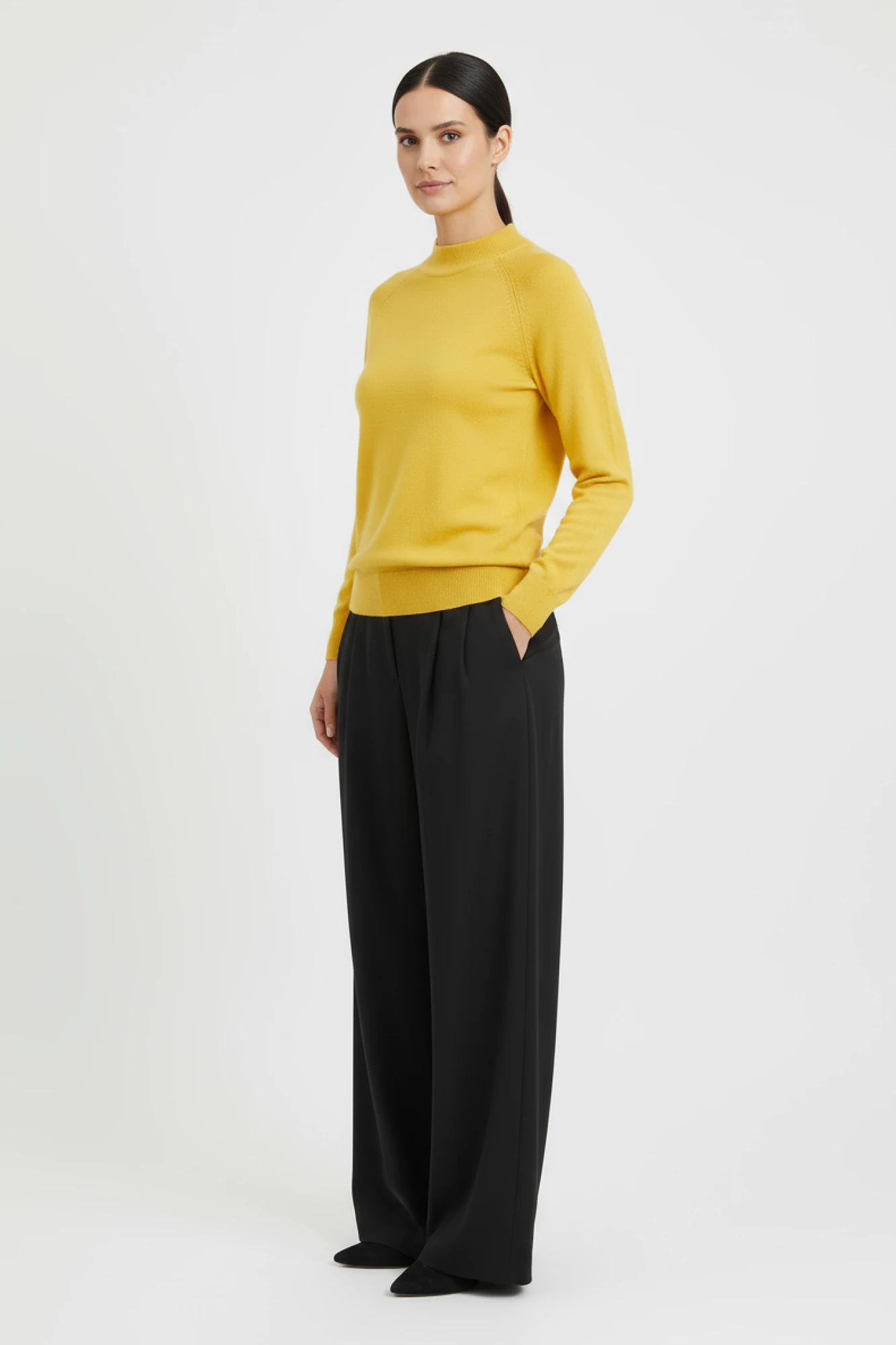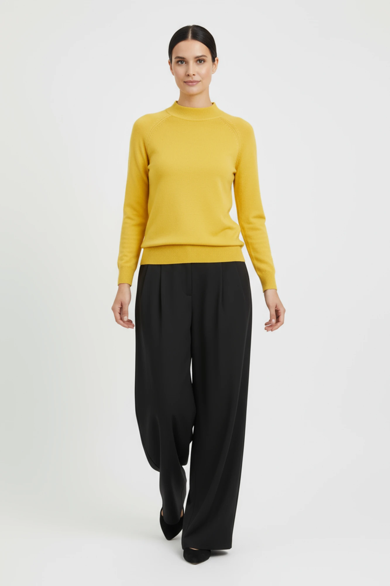 Свитер прямого силуэта с длинным рукавом "реглан". Низ изделия и рукавов заработан ластиком 1х1. Воротник - двойная ластичная стойка