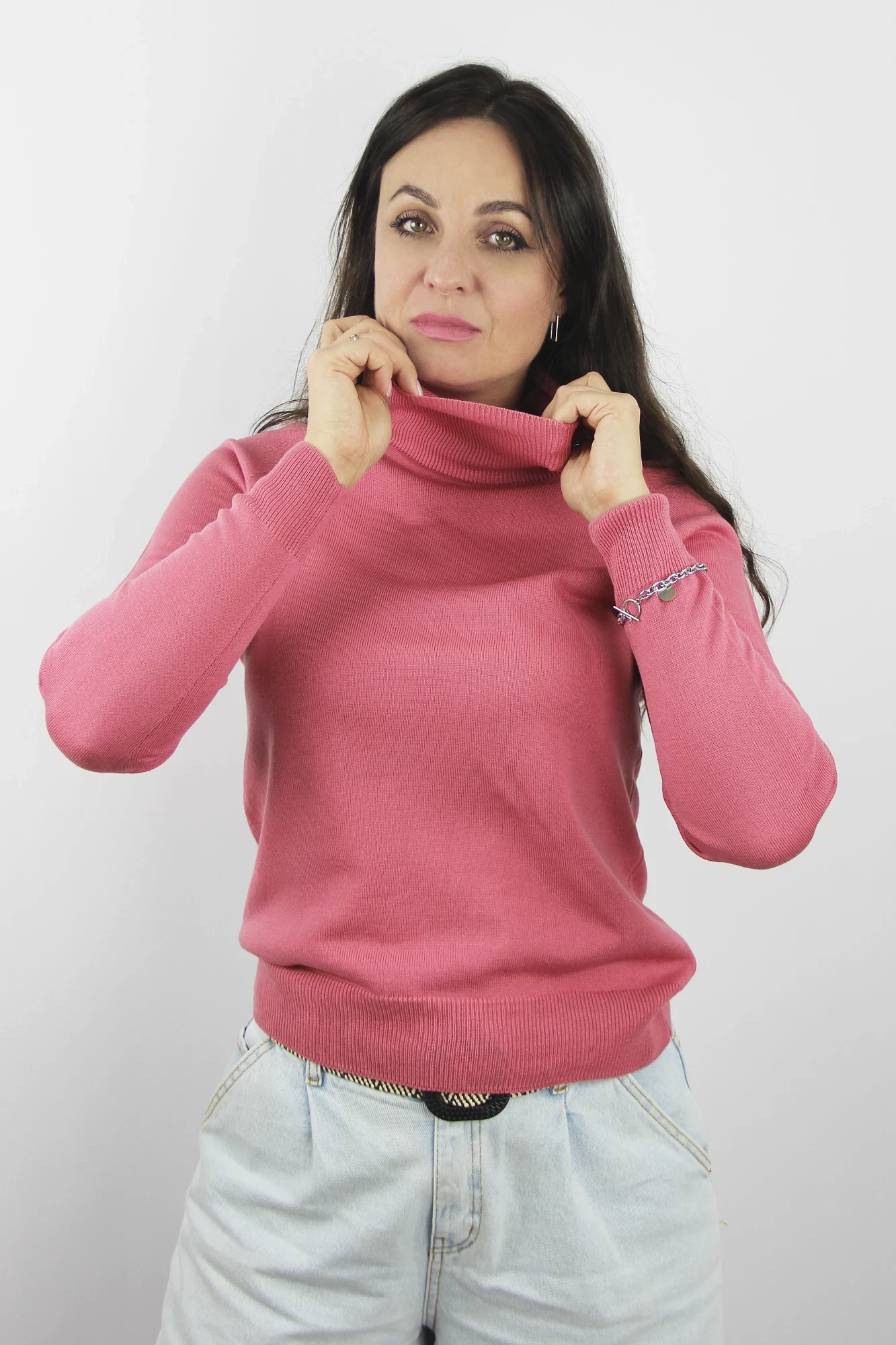 Свитер прямого силуэта, второго слоя одежды, с длиным рукавом реглан. Круглый вырез горловины обработан высоким ластичным воротником-ластик высотой в готовом виде 16см+-1,0см в том числе сдвоенная кулирная гладь 1,0см+-0,2см.