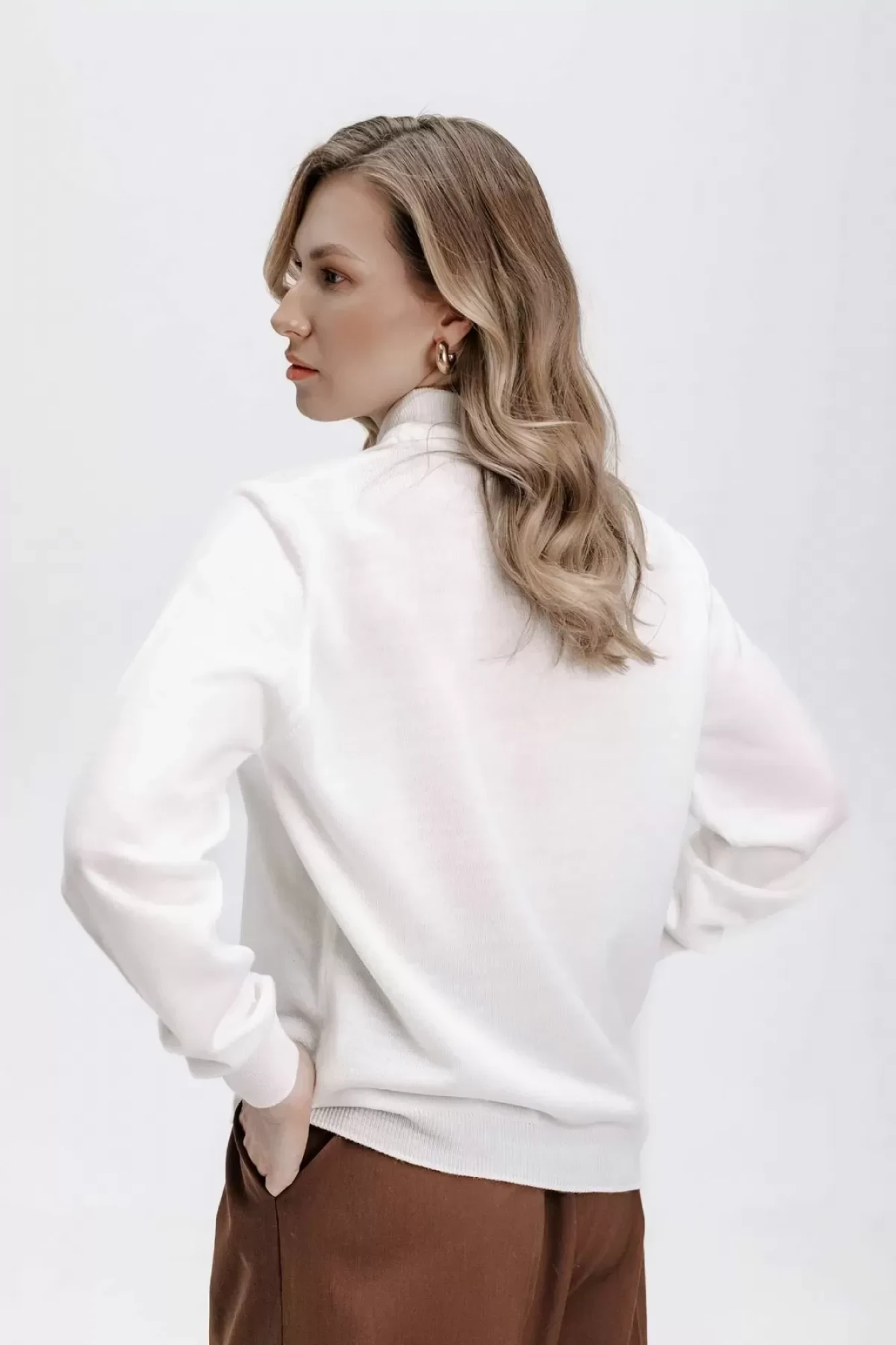 Свитер женский ,второго слоя одежды, с длинным втачным рукавом. Низ изделия и рукавов заработан ластиком 1х1, высотой в готовом виде 4,5см+-0,5см(станы),5,0+-0,5см (рукава). Воротник - двойная ластичная стойка 6,0см+-0,5см в готовом виде, полукеттлевка. По краю низа рукава проложена пряжа полушерстянная высокорастяжимая "Новинка" 110т