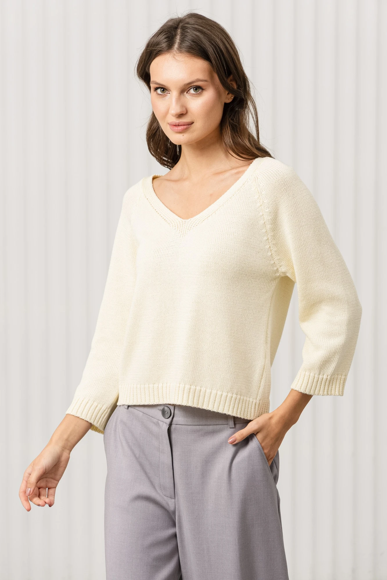 Джемпер прямого силуэта связан из пряжи, в состав которой входит 50% хлопка,50% ПАН. Джемпер очень мягкий и приятный к телу, вывязан переплетением кулирная гладь. Рукав реглан прямой, длиной 7/8.V-образная горловина обработана цельновывязанной бейкой. Низ изделия, низ рукава связаны переплетением ластик 2*2