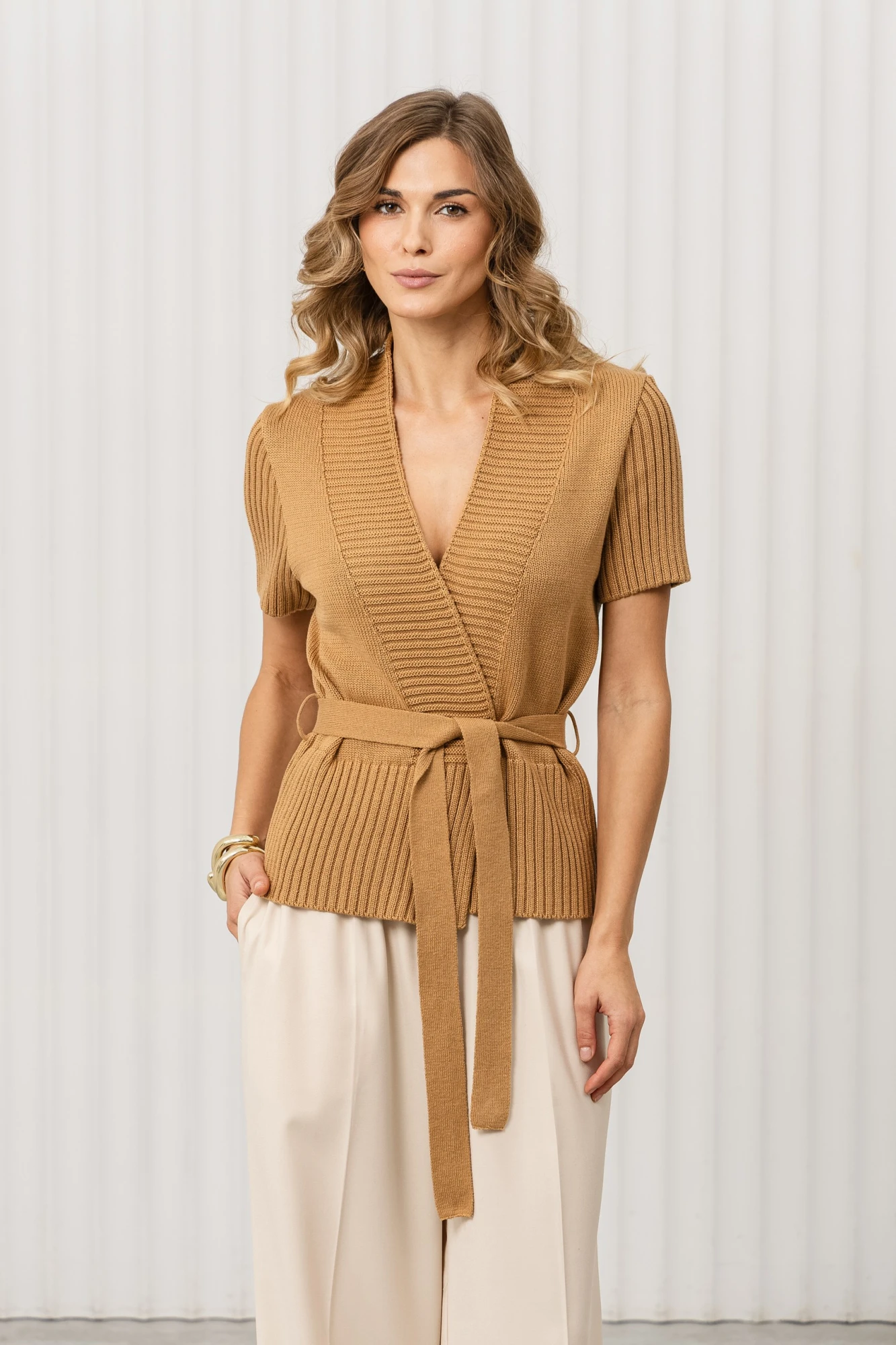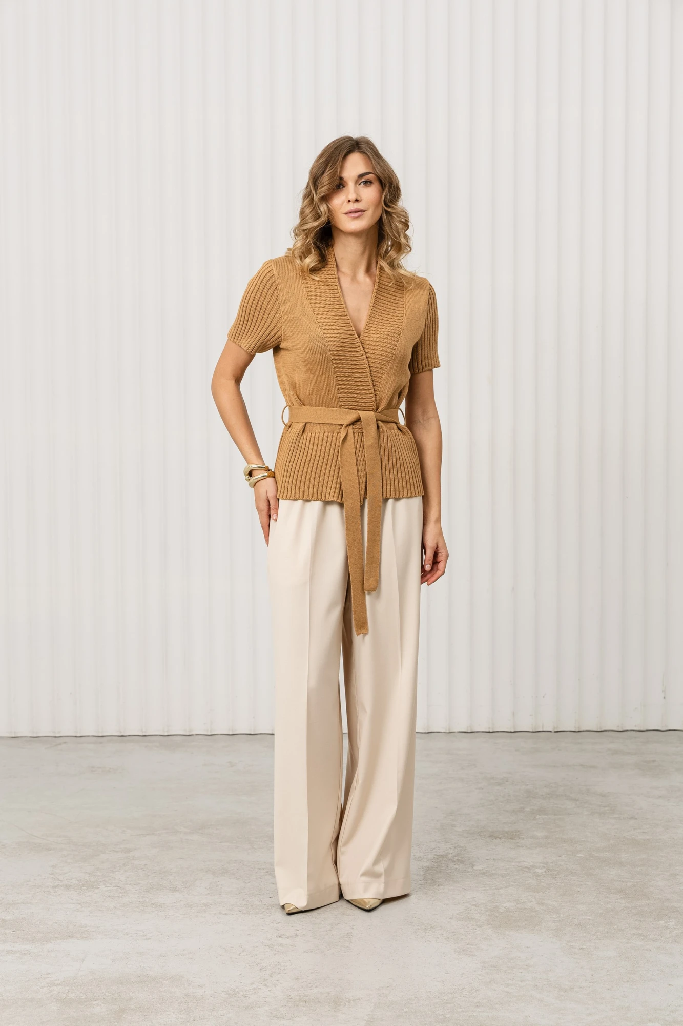 Дизайн: топ с V-образным вырезом и короткими рукавами. Ребристая текстура и завязка на поясе придают изделию оригинальность и женственность, подчёркивая фигуру;