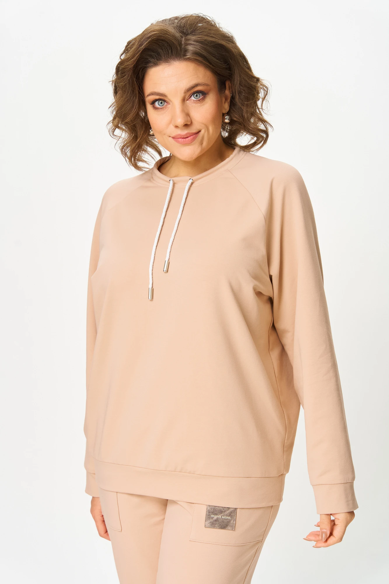 Джемпер женский из трикотажной хлопковой ткани (двунитка). Рукав реглан. Низ рукава обработан притачной манжетой. Низ изделия оформлен притачным поясом. На спинке настрочен декоративный элемент. Вырез горловины круглый, обработан бейкой со шнуром.