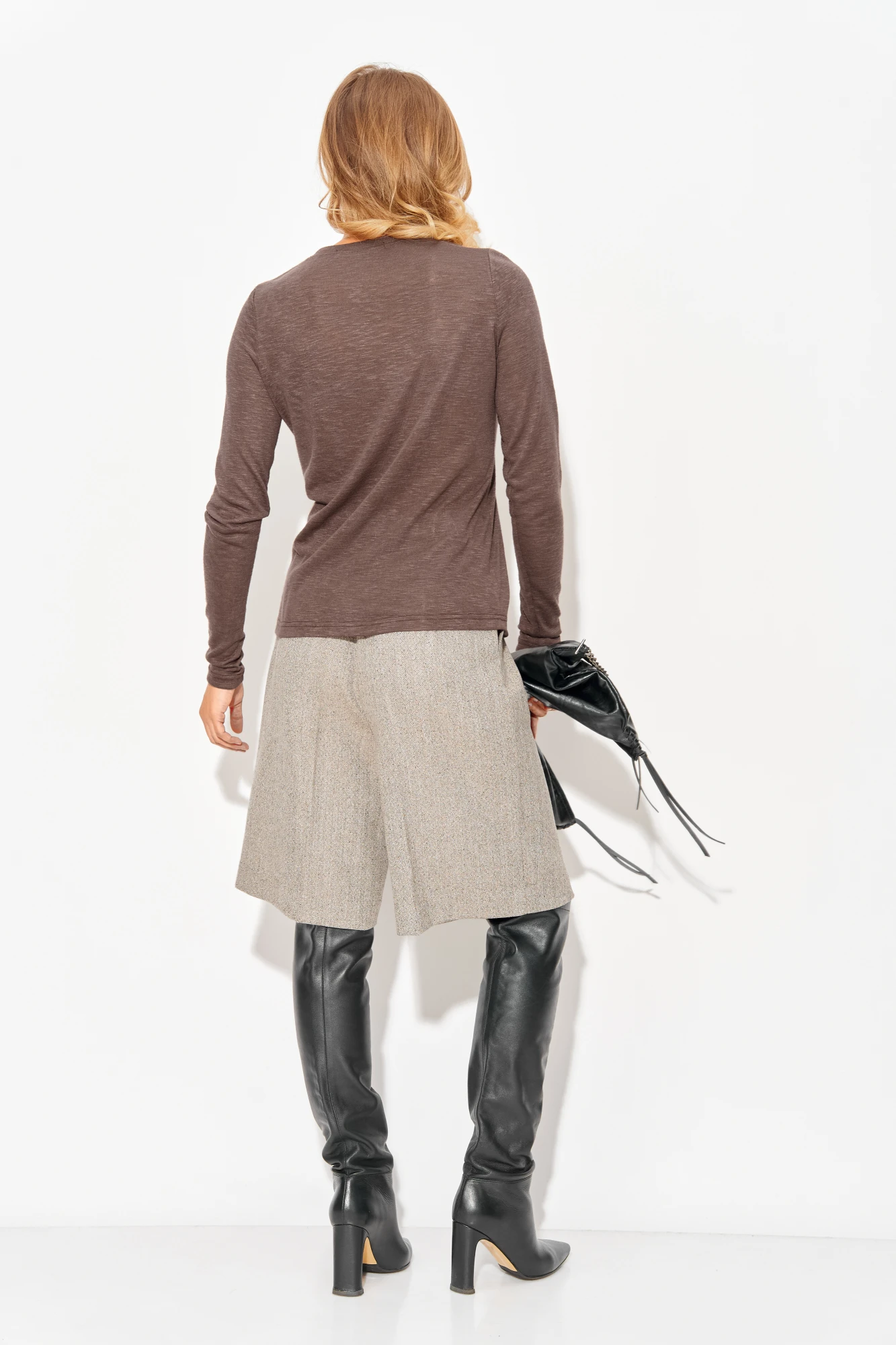 Лонгслив из трикотажа, полуприлегающего силуэта. Рукав втачной, зауженный к низу. Горловина округлой формы, обработана бейкой. По низу изделия настрочена декоративная нашивка. Полупрозрачная текстура трикотажа делает изделие стильным и романтичным. Длина по центру спинки 62 см. Длина рукава 68см.