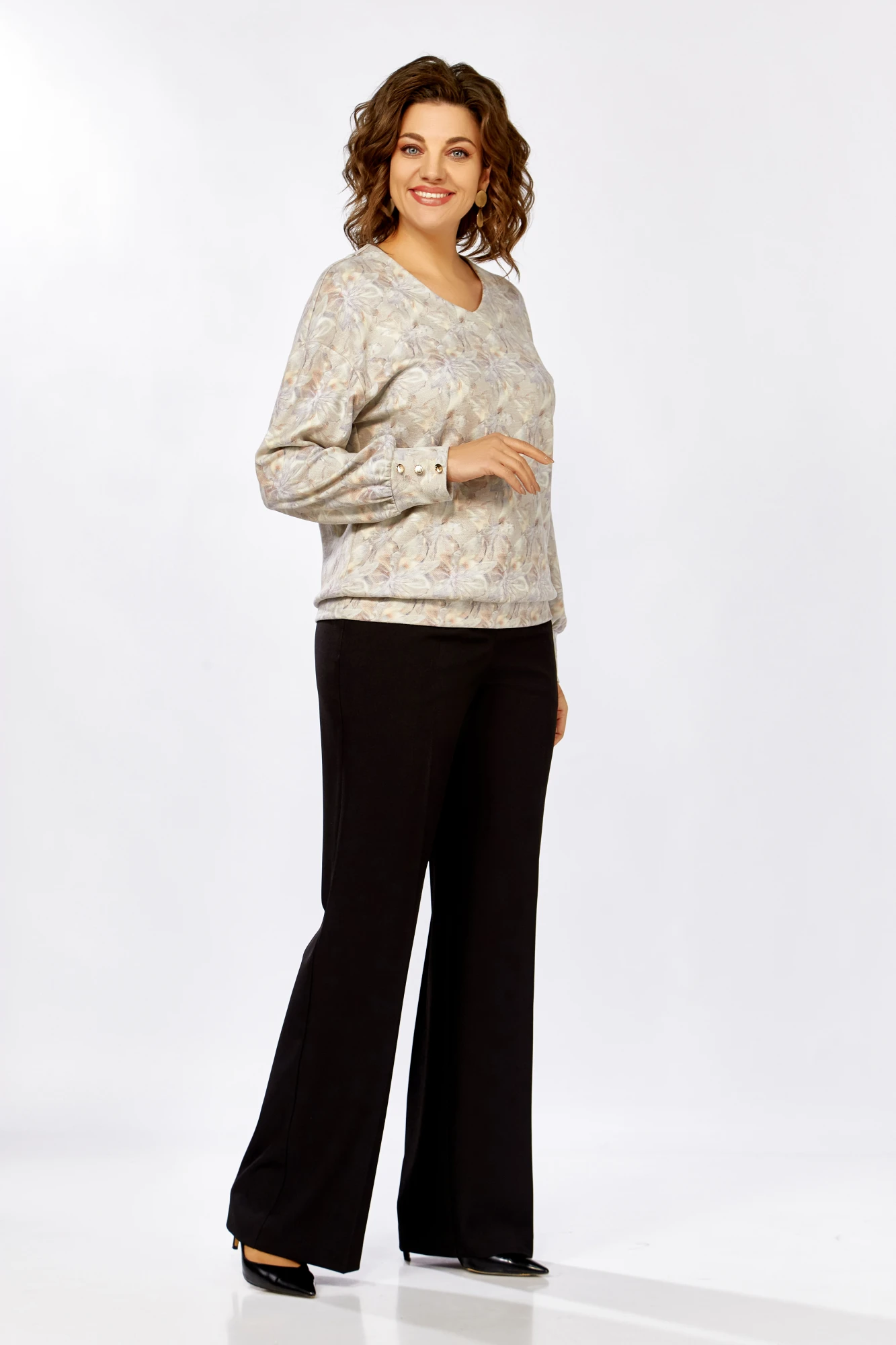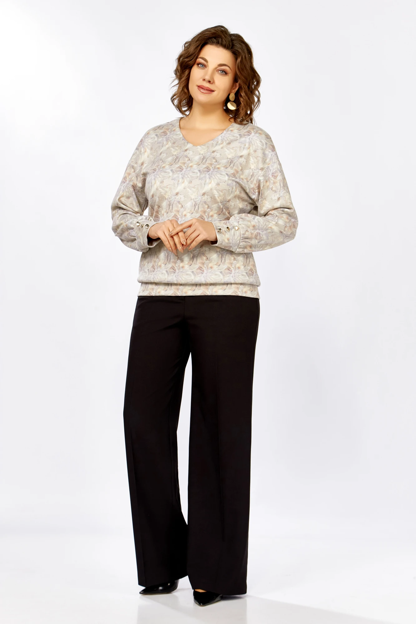 Джемпер из мягкого вискозного трикотажного полотна свободного силуэта со спущенной линией плеча. Горловина мягкой V-образной формы, рукав длинный, по низу присобран на манжеты из основной ткани, которые украшены тремя декоративными пуговицами. Низ джемпера оформлен притачной планкой из основной ткани.