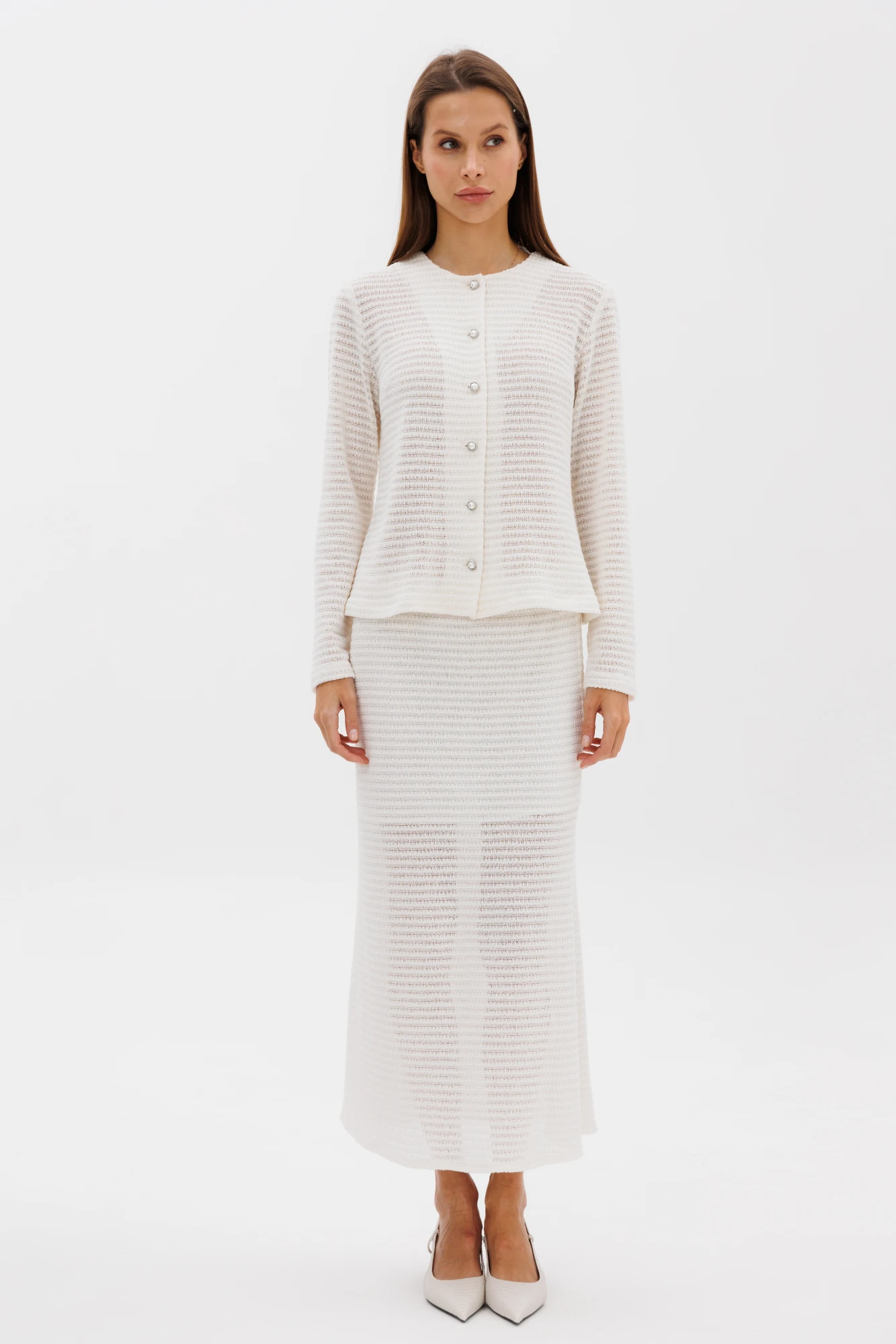 Кардиган в молочном цвете - это стильный, универсальный, уютный предмет гардероба с акцентными металлическими серебряными пуговицами. Изделие выполнено из мягкого трикотажного полотна. Рукав втачной, застёжка центральная на петли - пуговицы, горловина округлая.