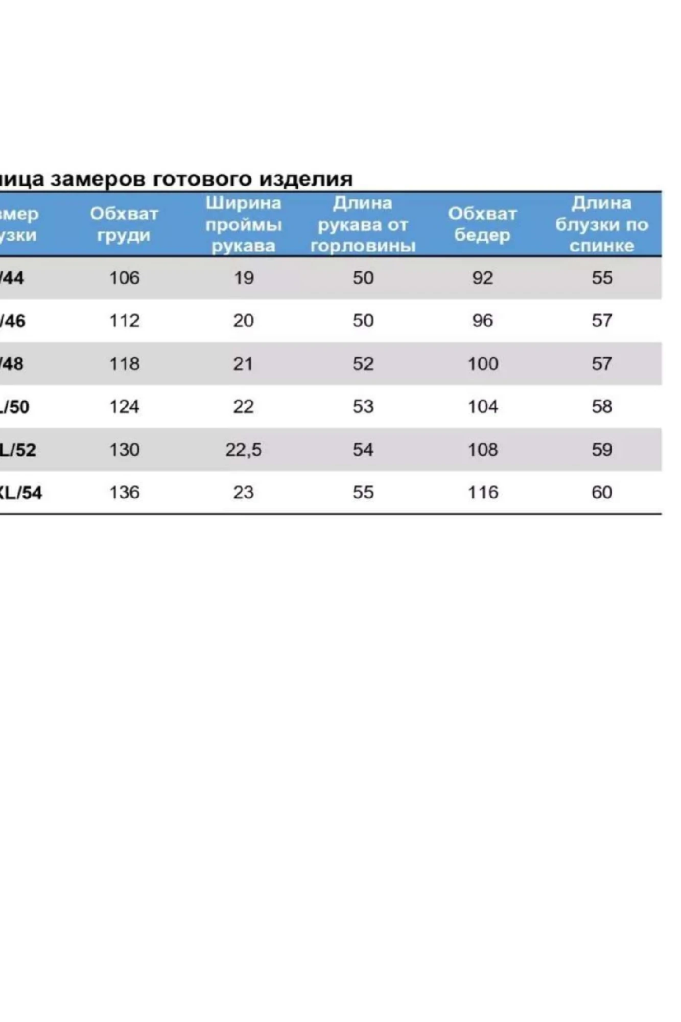 Таблица размеров