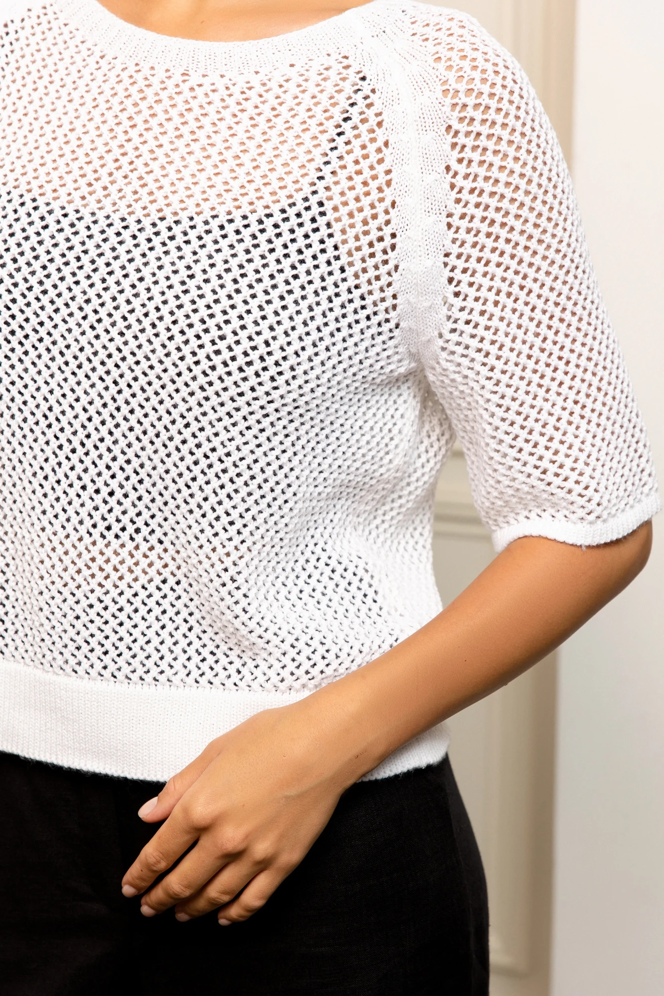 Дизайн: свободный крой с короткими рукавами и круглым вырезом, дополненный ажурным узором;