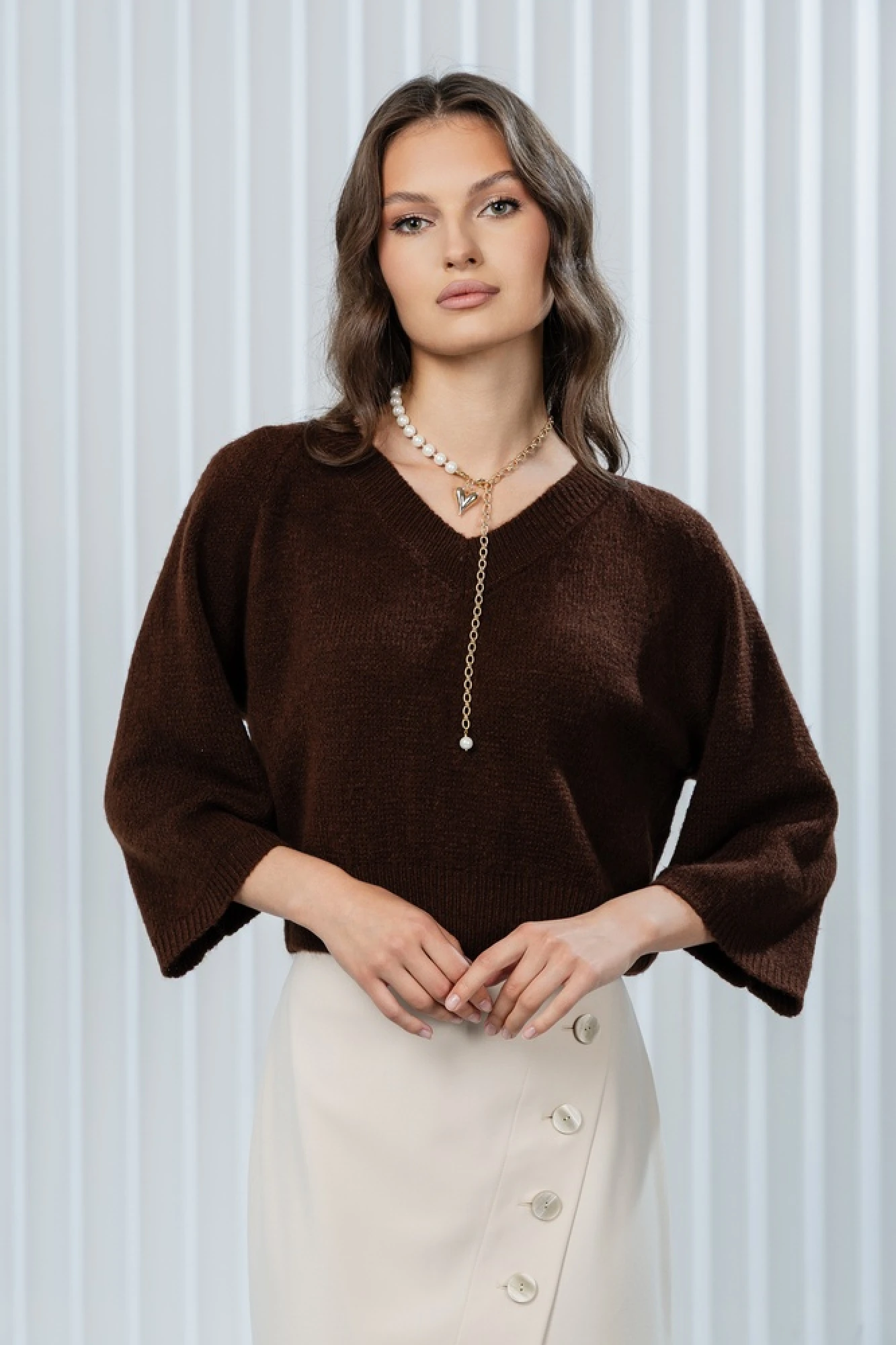 Дизайн: джемпер с V-образным вырезом и объёмными рукавами 3/4, что придаёт изделию оригинальность и уют. Простой, но стильный крой подчеркивает женственность и комфорт;