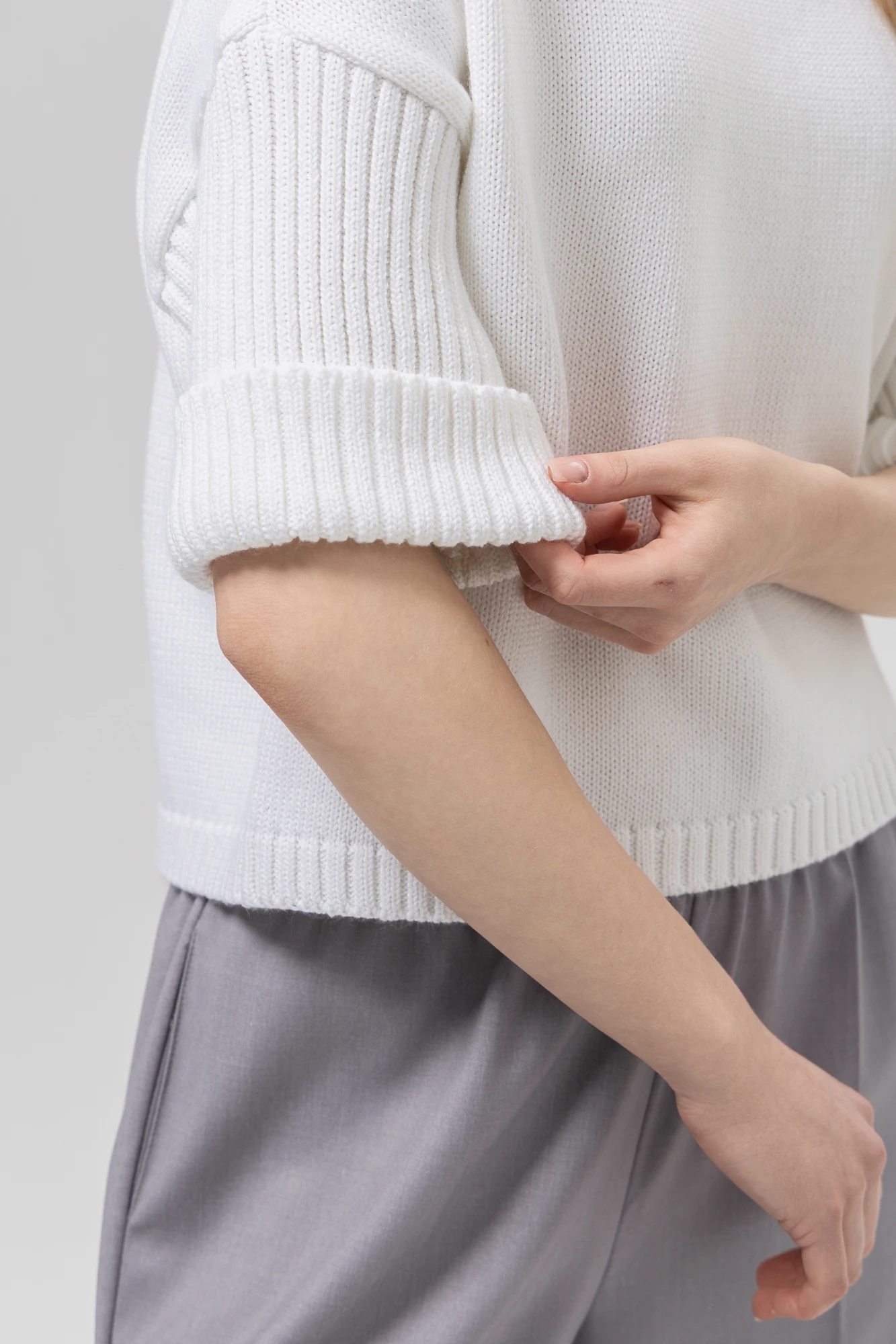 Дизайн: укороченный джемпер с короткими рукавами и отстроченными манжетами, что придаёт изделию оригинальность и стиль. Круглый вырез горловины и ребристая текстура подчёркивают женственность и уют;