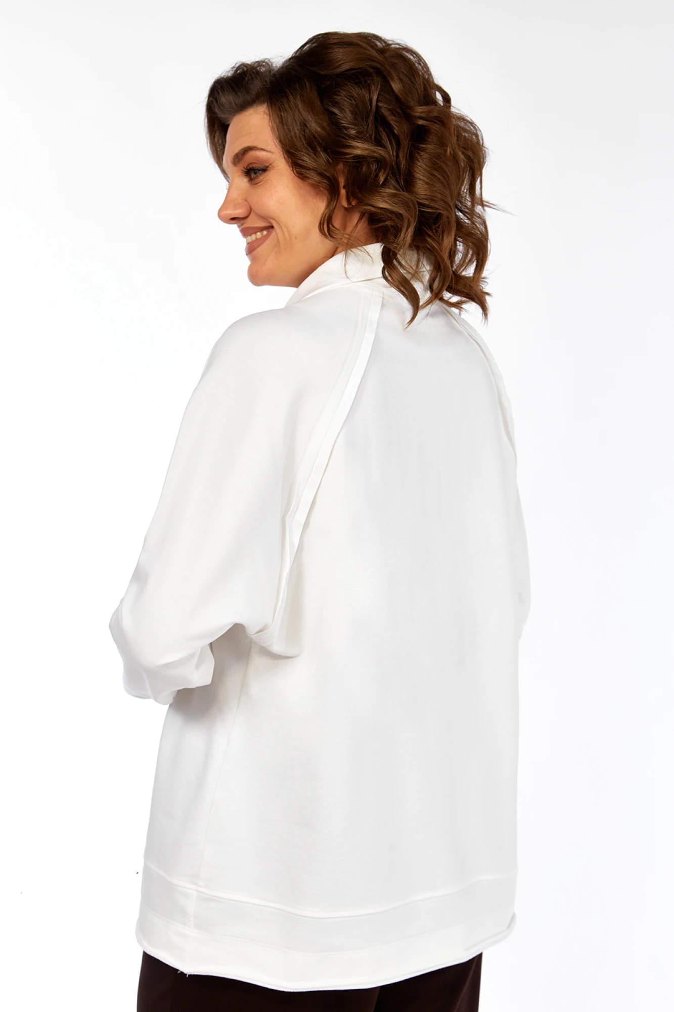Джемпер женский свободного силуэта изготовлен из хлопкового полотна, с воротником стойка на молнии. Перед и спинка в области бедер с декоративным подрезом. Рукава — реглан. Низ изделия, низ рукавов и швы втачивания рукавов выполнены необработанным срезом. Джемпер дополнен дизайнерской печатью.