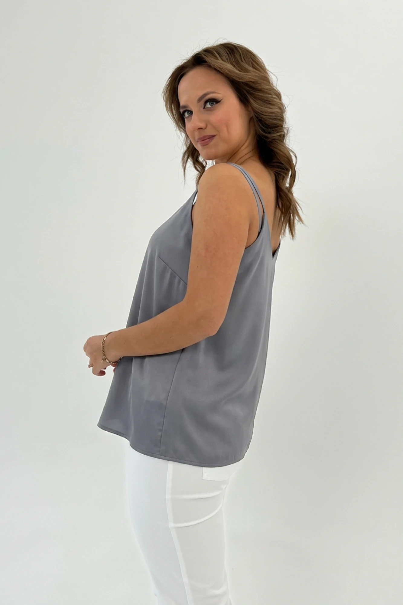 Женский атласный топ А-образного силуэта с V-образным вырезом на тонких бретелях – неотъемлемая часть базового гардероба. Ткань приятна к телу и комфортна в уходе. Топ прекрасно дополняется блузкой-рубашкой модель 16243.