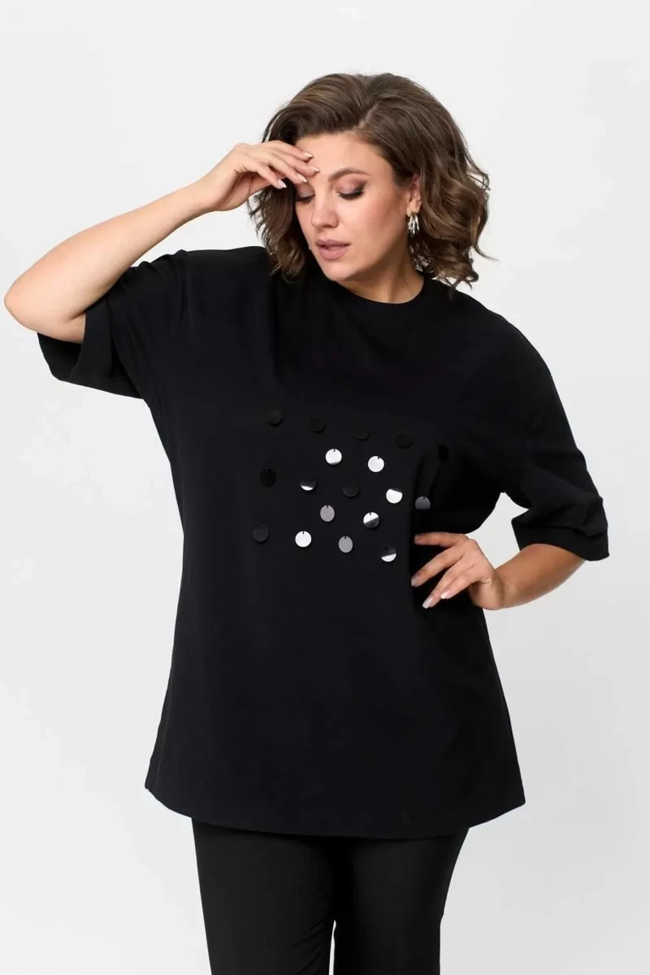 Майка свободного силуэта, со спущеным рукавом. Рукав короткий, чуть ниже локтя. По центру переда декор из крупных пайеток.