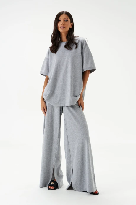 Футболка прямого свободного кроя. Выполнена из хлопкового полотна серого цвета. Вырез горловины круглый. Рукав втачной, спущенный. Длина рукава от линии втачивания 17 см. Длина спинки 71 см