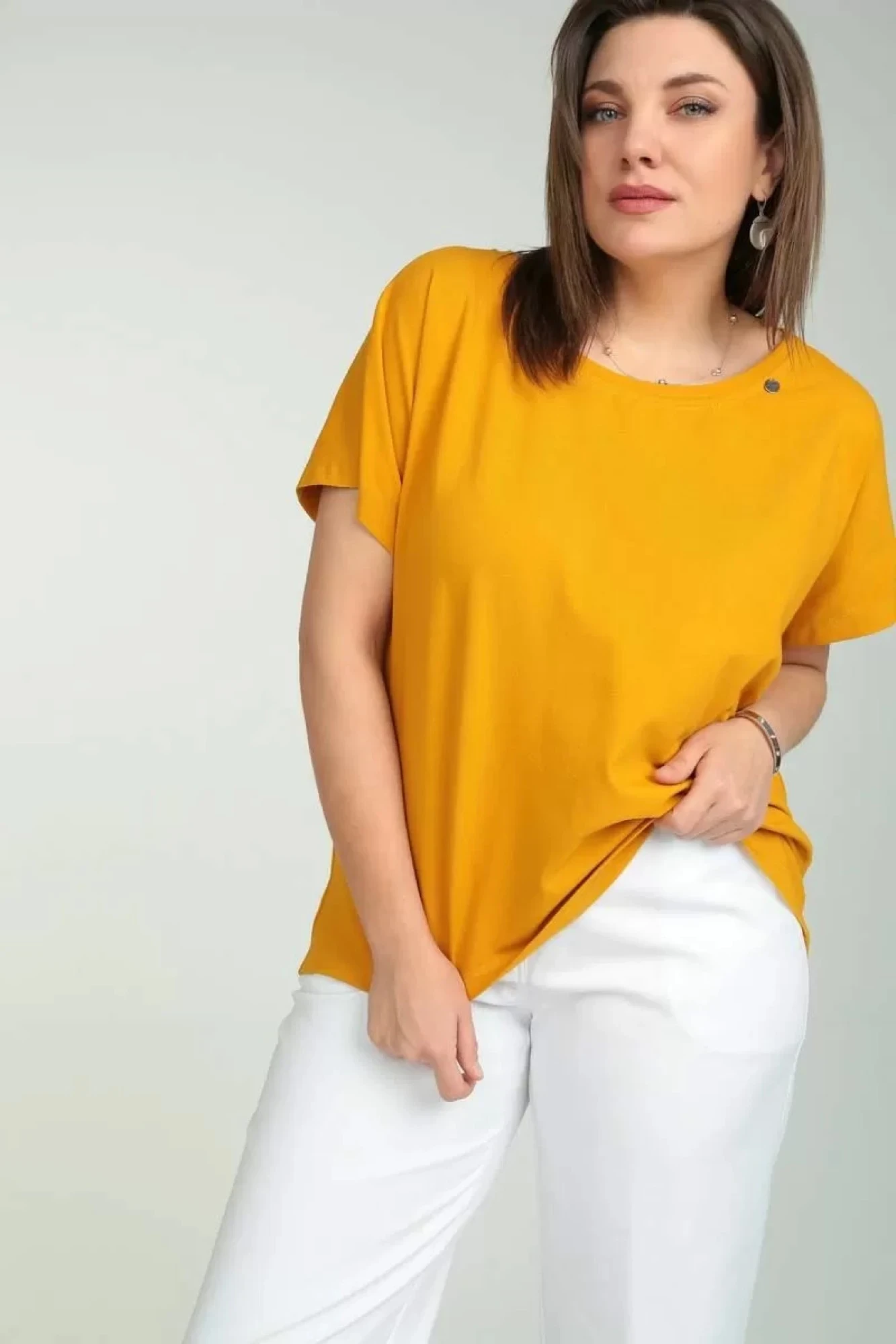 : Футболка свободного кроя со спущенной линией плеча, удлинённой спинкой. Имеются декоративные элементы.