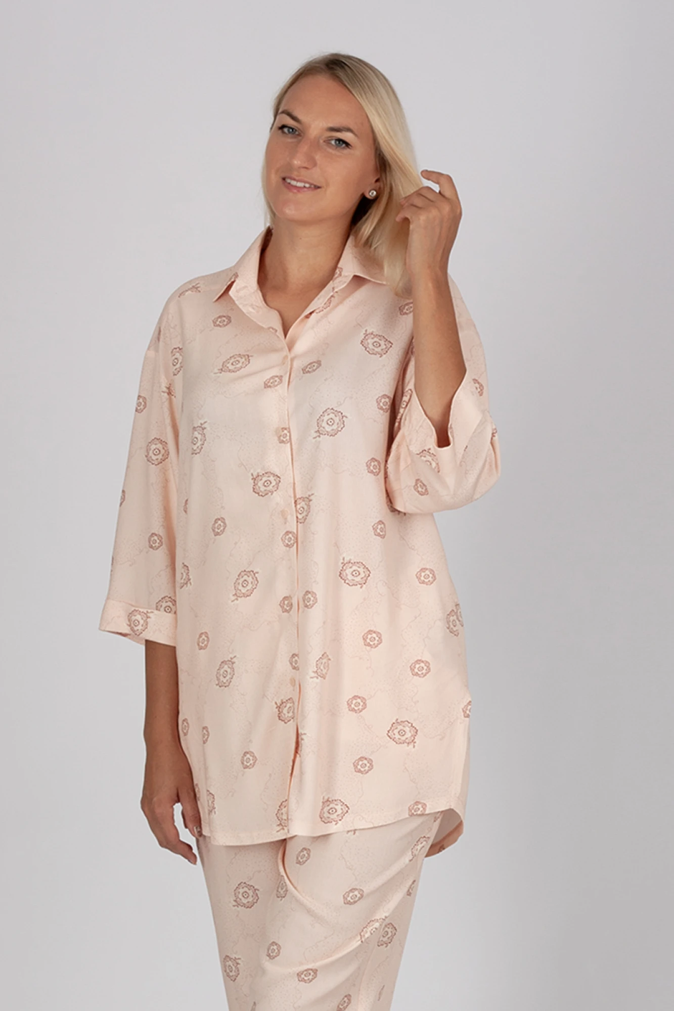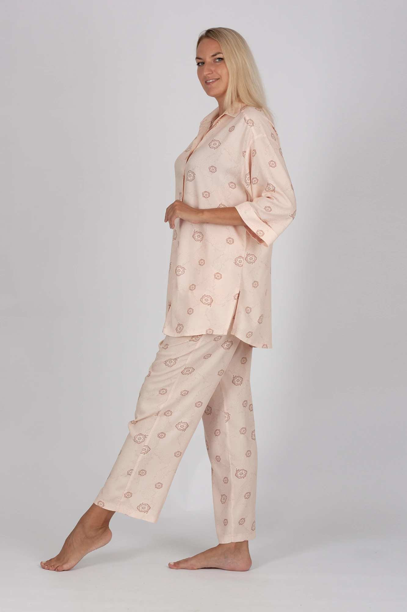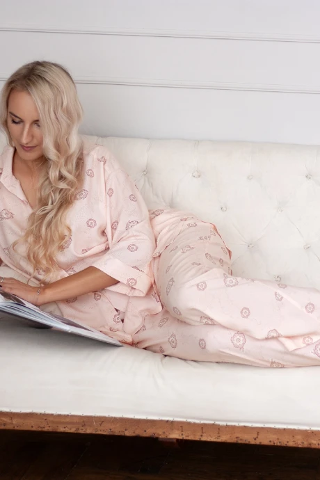 Комфортный комплект-пижама выполнена из шелковистого вискозного штапеля (текстиль), застежка на пуговицы, отложной воротник, длинный рукав. Брюки длинные, пояс на резинке, карманы. Рекомендована сухая утюжка изделия, без пара.