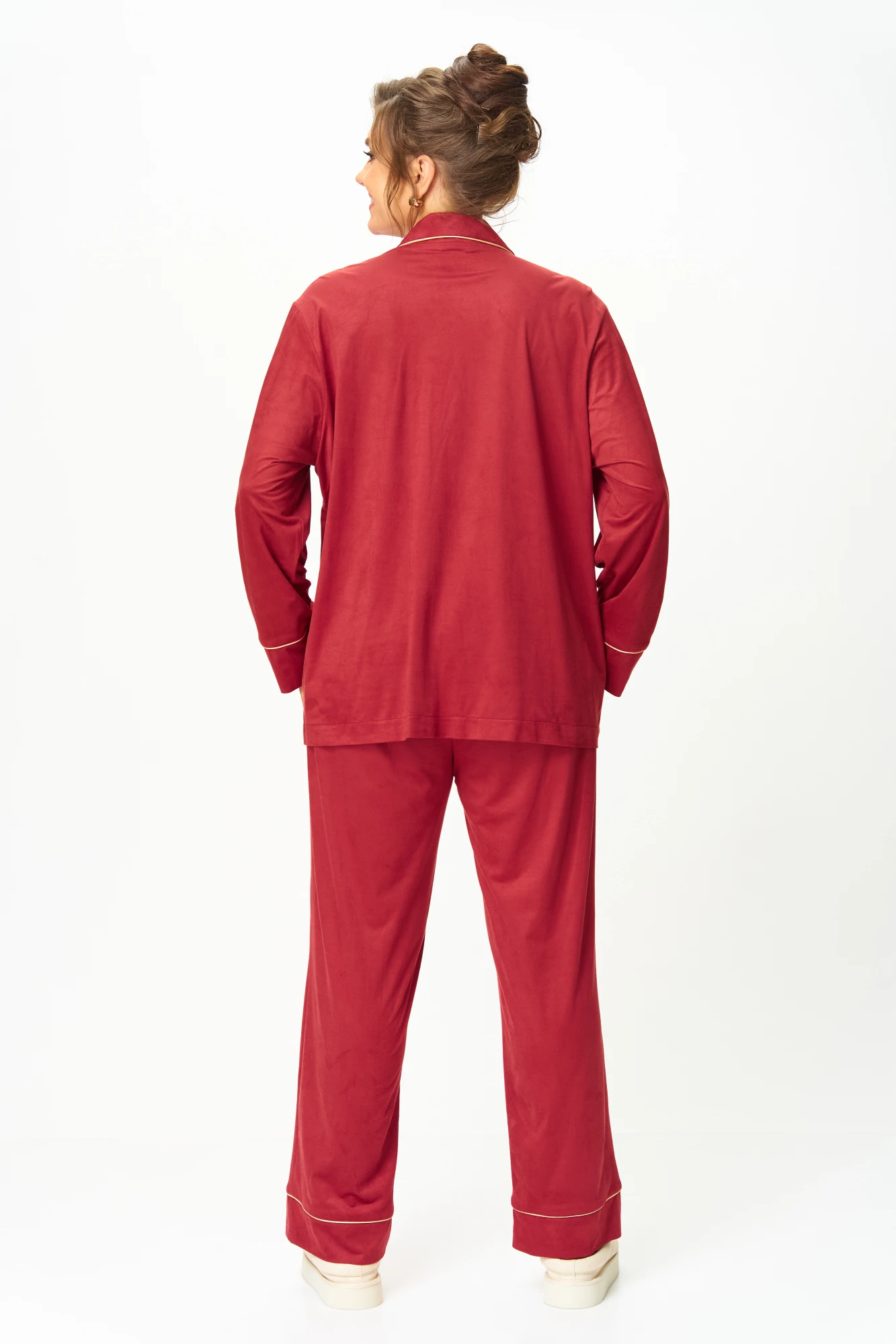 Костюм женский из текстильного полотна состоящий из жакета и брюк . Жакет без подкладки прямого силуэта на центральную застежку на петли и пуговицы , воротник пиджачного типа . Брюки с высокой посадкой на резинке с боковыми карманами .