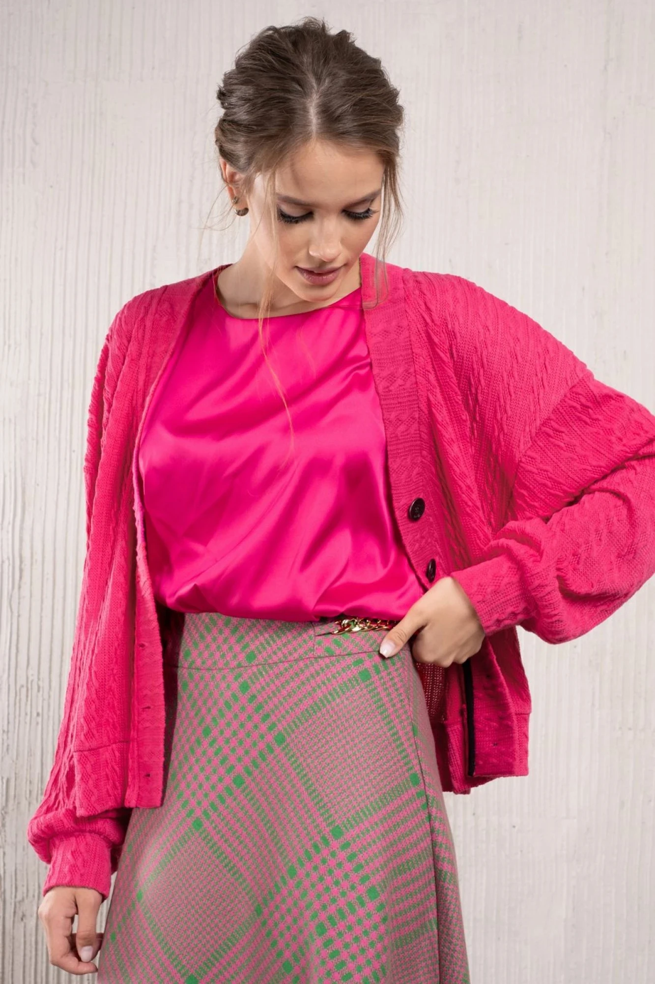 Трикотажный кардиган свободного кроя. Застежка спереди на пуговицы. Длина по спинке в 44-46-48 размерах 57 см, в 50-52-54 размерах 59 см. Рукав втачной на спущенной пройме. Длина рукава полный.