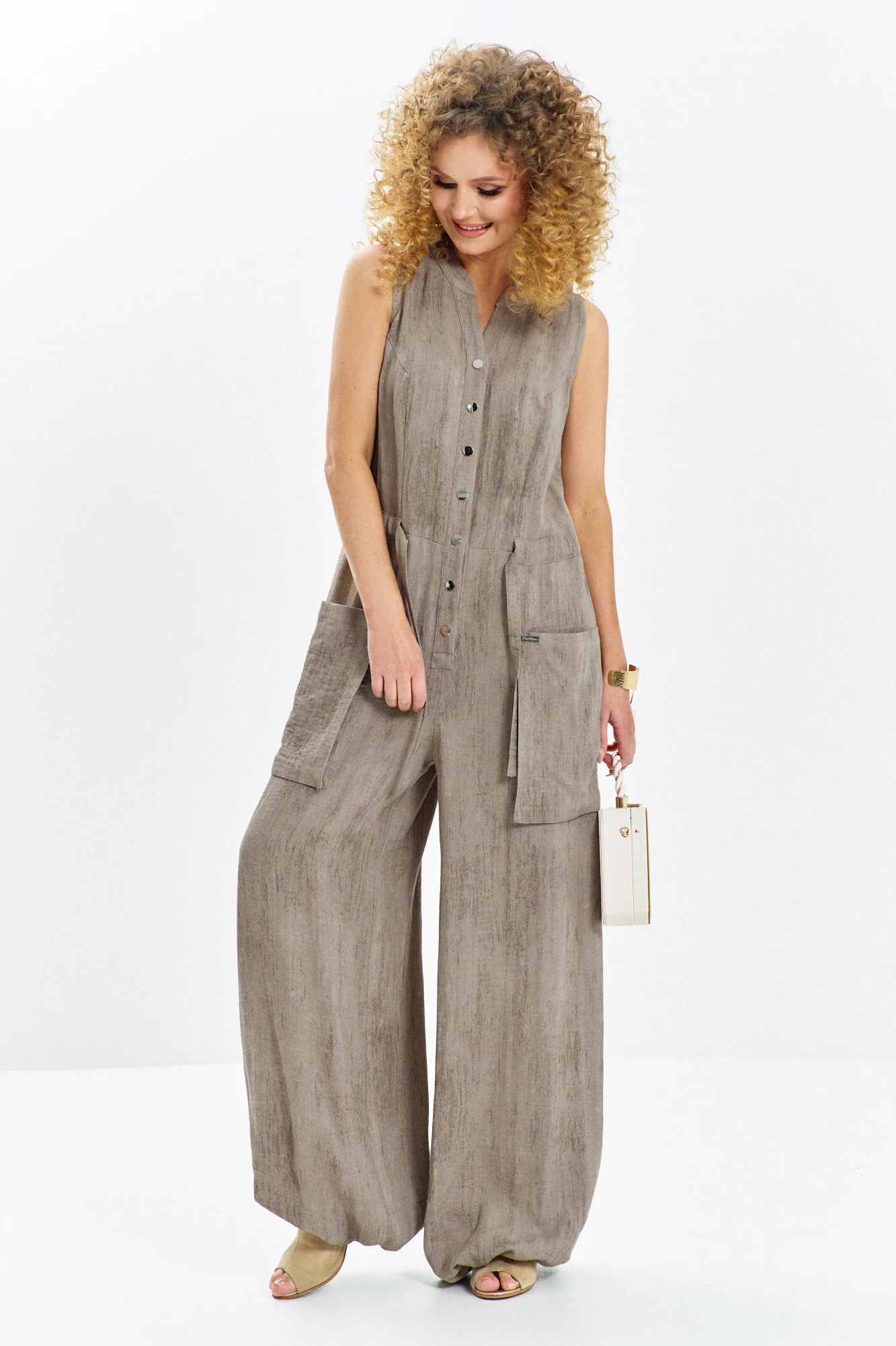 Комбинезон летний свободного кроя , оверсайз не сковывает движений, создавая вокруг вас облако легкости. Акцентная планка с застежкой на кнопки по всей длине переда визуально вытягивает рост, добавляя образу стройности и динамики. Горловина - округлая с плосколежащей стойкой.