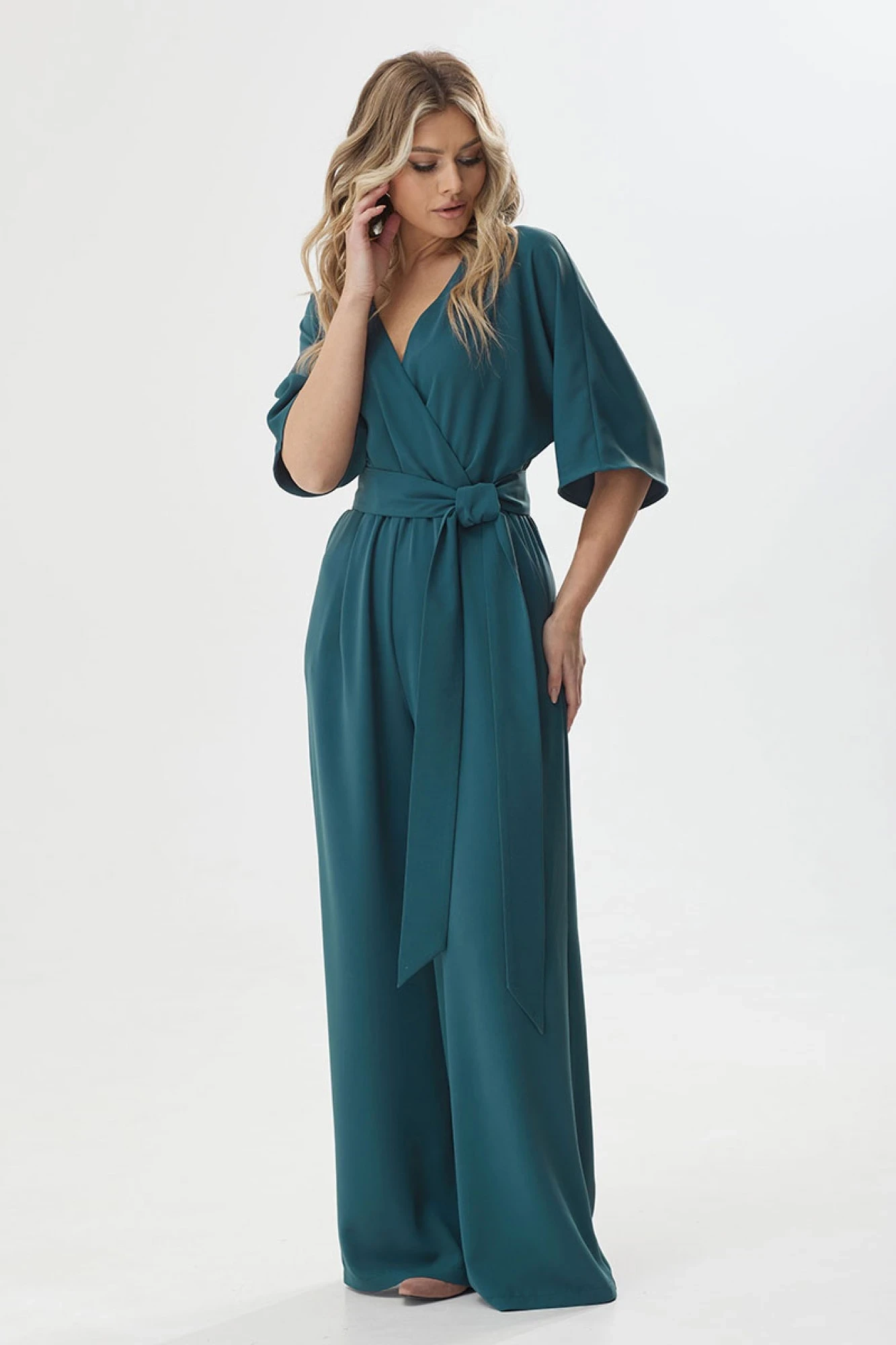 Нарядный комбинезон полуприлегающего силуэта с расширенными книзу брюками из струящейся ткани. Комбинезон отрезной по линии талии на резинке, верхняя часть комбинезона на запах. Рукав цельнокроеный длиной до локтя. По спинке V-образный вырез, в среднем шве центральная застежка на потайную молнию. В боковых швах карманы. В комплект входит пояс из основной ткани.