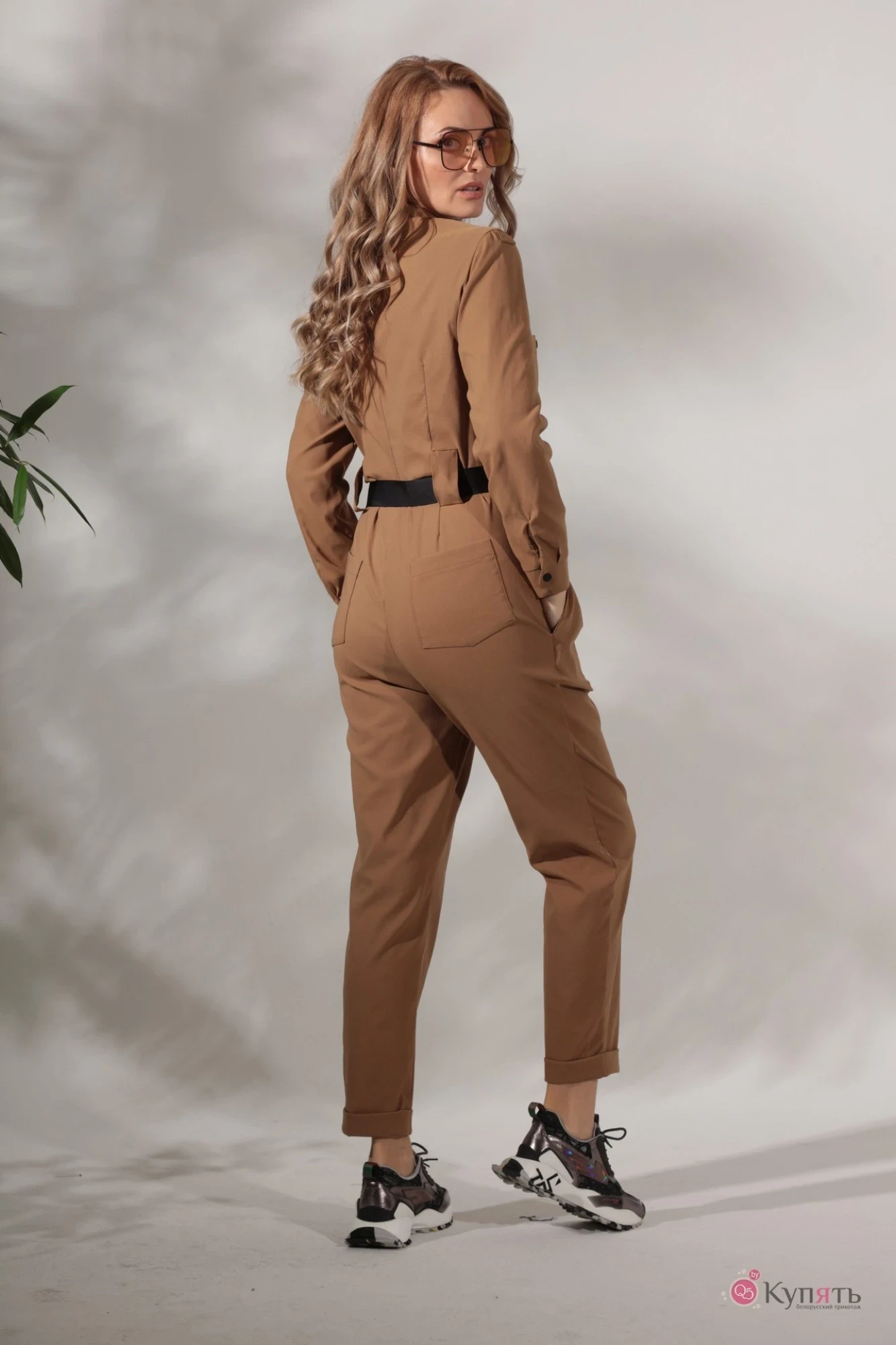 Стильный комбинезон полуприлегающего силуэта с центральной застежкой на кнопки, втачным воротником с отрезной стойкой. По переду на уровне груди накладные карманы. Так же комбинезон дополнен боковыми карманами. Рукав втачной с манжетой с застежкой на кнопку. Комбинезон притален съемным поясом, выполненным из текстильной тесьмы-стропы. Пояс в комплекте. Длина от плечевого шва 139см. Длина рукава 60см.