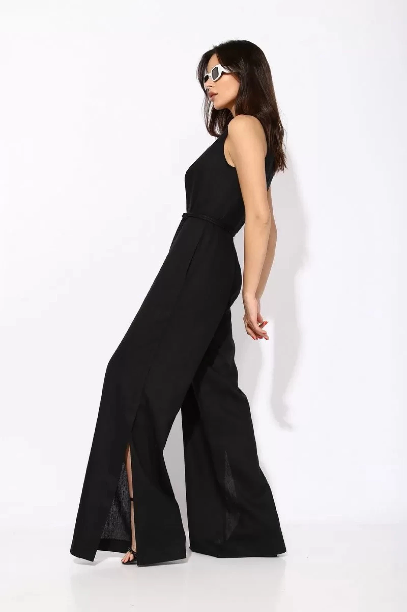 Комбинезон женский приталенного силуэта, отрезной по талии, брюки свободные с боковыми карманами. В боковых швах высокие открытые шлицы, изящно подчеркивающие ноги. По переду нагрудные вытачки. Спинка с вытачками и застежкой на потайную тесьму молнию по среднему шву. Вырез горловины округлый. Практичный и удобный комбинезон выполнен из льняного полотна. Дополнением служит съемный пояс-шнур с золотыми наконечниками. Идеальный вариант комбинезона для выходного дня и неформального стиля, поможет выглядеть стильно и элегантно, при этом чувствуя себя свободно, легко и комфортно на любом торжестве и мероприятии. Длина изделия по среднему шву спинки 149 см. Длина брюк от талии по боковому 110 см.