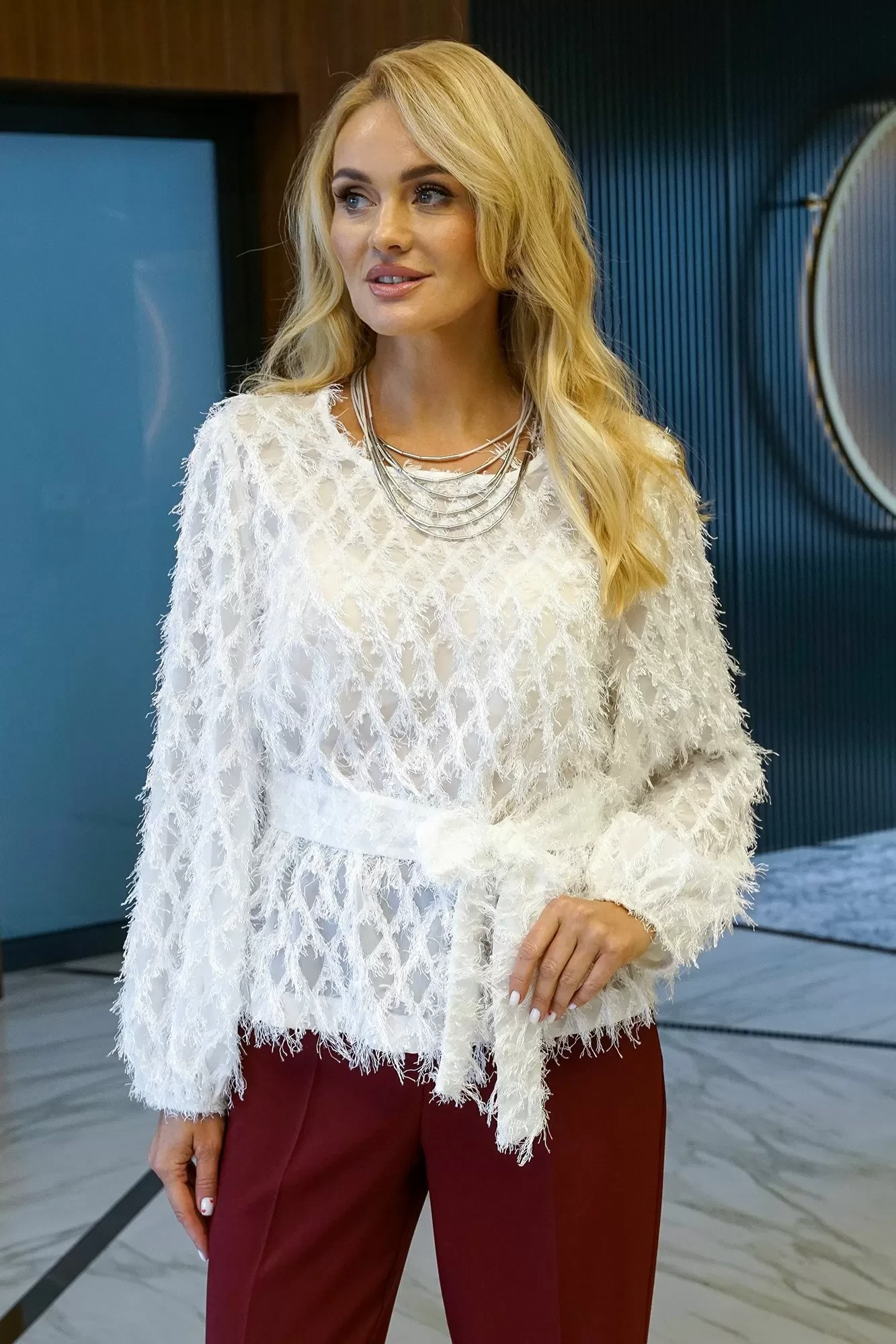 Блуза прямого силуэта, с поясом, с разрезом по среднему шву спинки и застёжкой на навесную петлю и пуговицу. Перед с нагрудными выточками. Рукава втачные, одношовные, длинные, понизу на резинке.