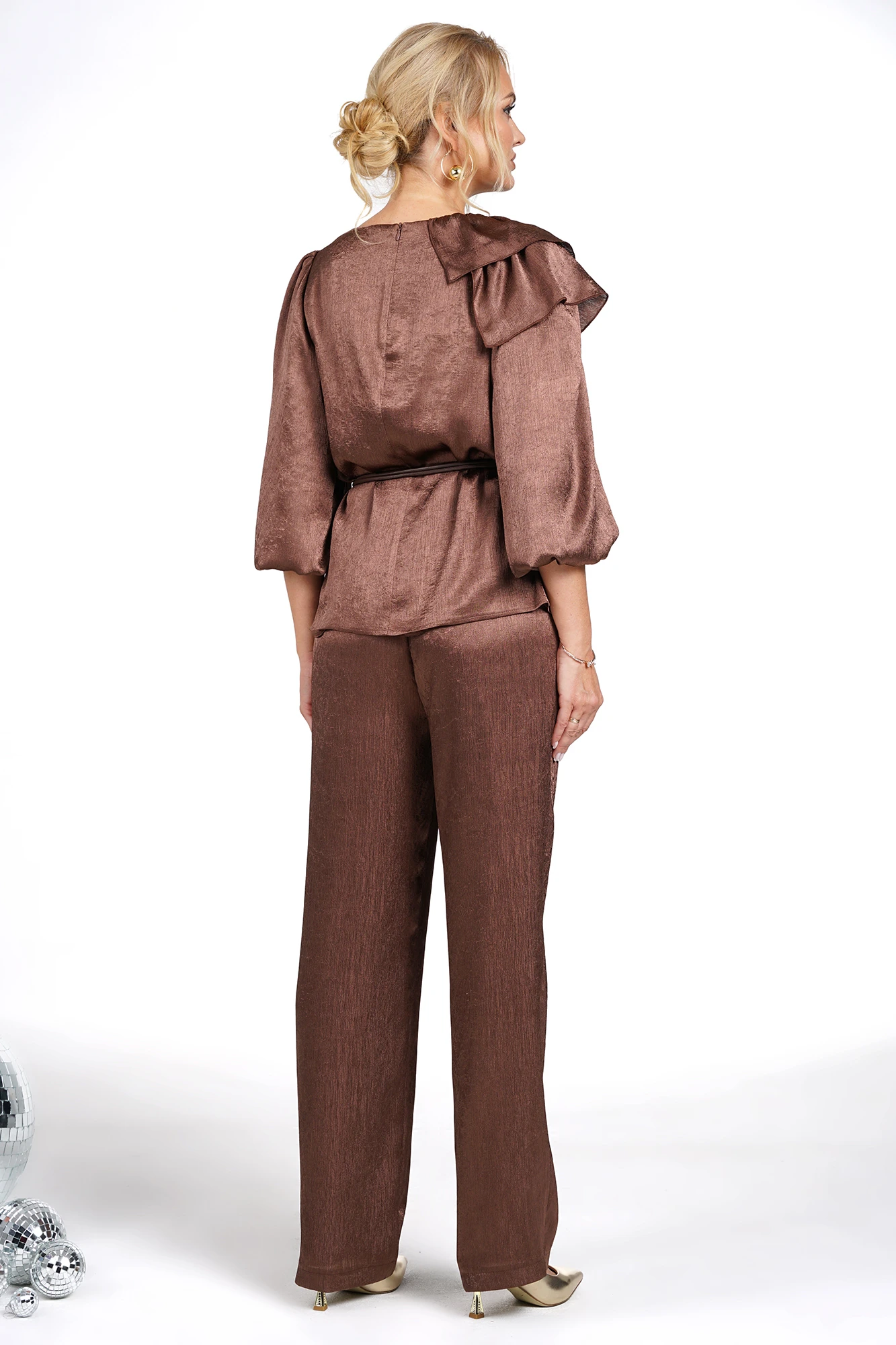 Блуза прямого силуэта, с застёжкой на потайную молнию в среднем шве спинки в дополнении ремень. Перед с нагрудными выточками и рельефным швом, декорированный воланами. Рукава на подкладке, втачные, одношовные, длиной 3/4, понизу объёмной формы, по окату и низу со сборкой.