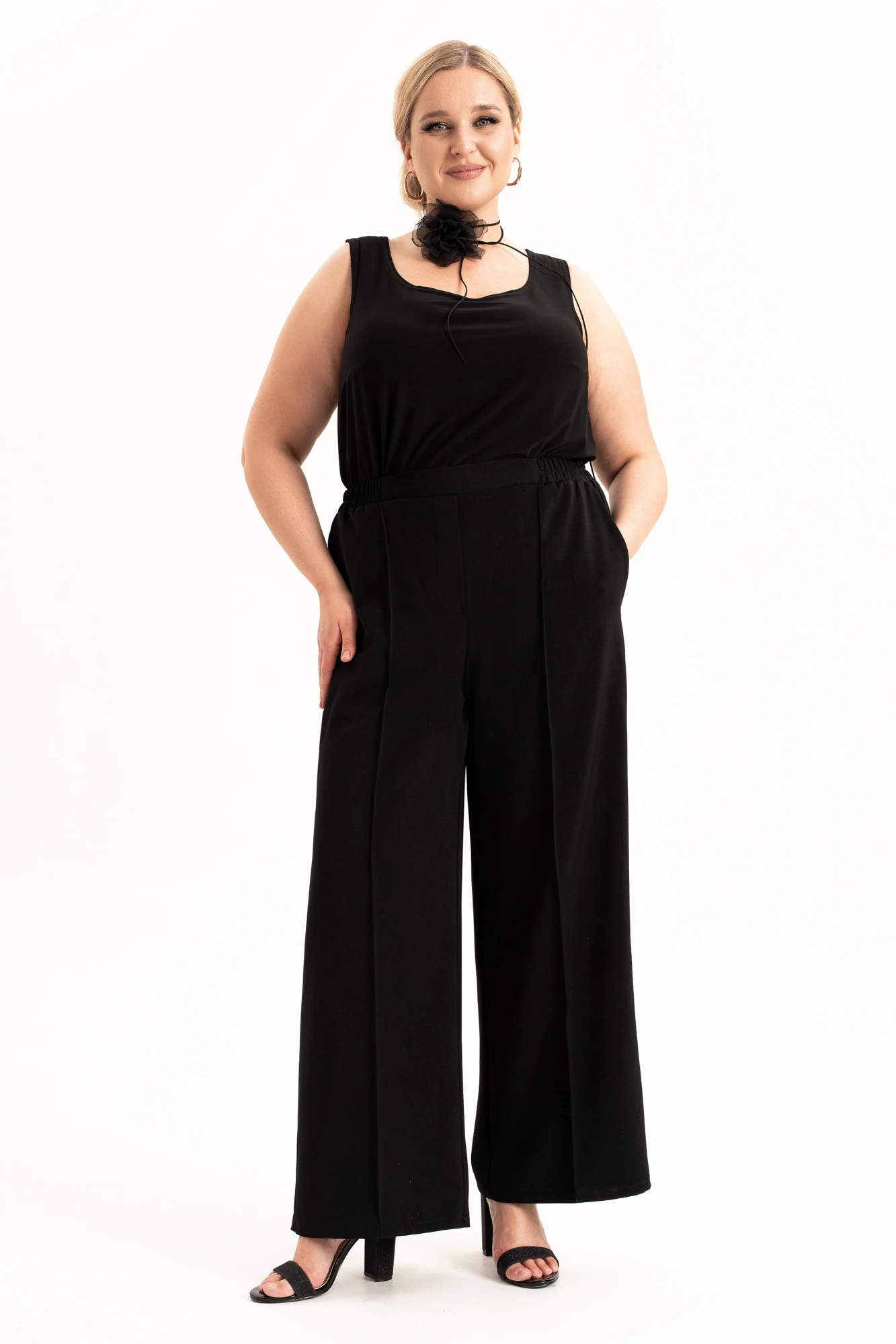 Этот базовый костюм идеально подходит для женщин, которые хотят выглядеть стильно и элегантно на любом мероприятии. Идеальный наряд, который придаст особый шик Вашему образу. Костюм состоит из брюк и блузы . Прекрасно подчеркнет Вашу фигуру и придаст вам очаровательный вид. Блуза-топ женская - это базовая, мягкая и приятная к телу модель для повседневной носки, занятий спортом, для отдыха, а также в качестве первого слоя под пиджак, кардиган и т.д.. Подходит для любого случая и времени года. Блуза без рукова из стрейчевой ткани с нагрудными выточками. Классические женские брюки — основа базового гардероба каждой современной женщины – это классика. Широкие брюки с высокой посадкой подчеркнут Ваш стиль и хороший вкус. Прямые формы и привлекательный дизайн делают их прекрасным выбором как для офисного повседневного образа, так и для особых случаев. Эти брюки подойдут как для высоких, так и для невысоких женщин. Брюки-палаццо на эластичной резинке с эмитацией гульфика. По переду расположены карманы с наклонным входом. Прошитые стрелки визуально вытягивают силуэт и добавляют образу строгости и элегантности. Брючный костюм больших размеров отличается высокой степенью практичности и универсальности,приобретая один комплект- Вы получаете много образов, комплектуя элементы комплекта с другими вещами из своего гардероба!