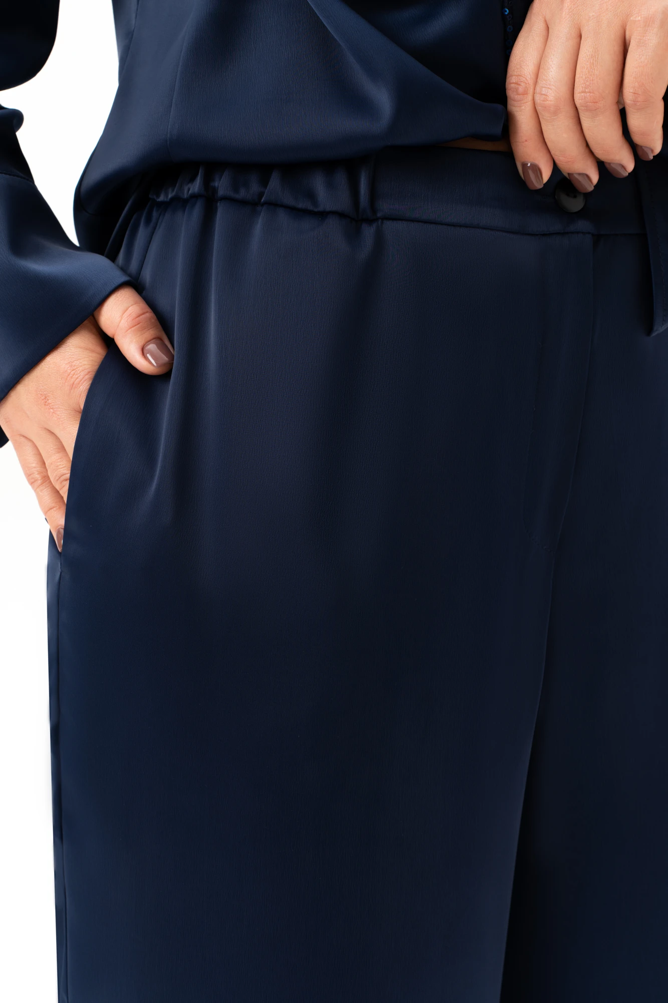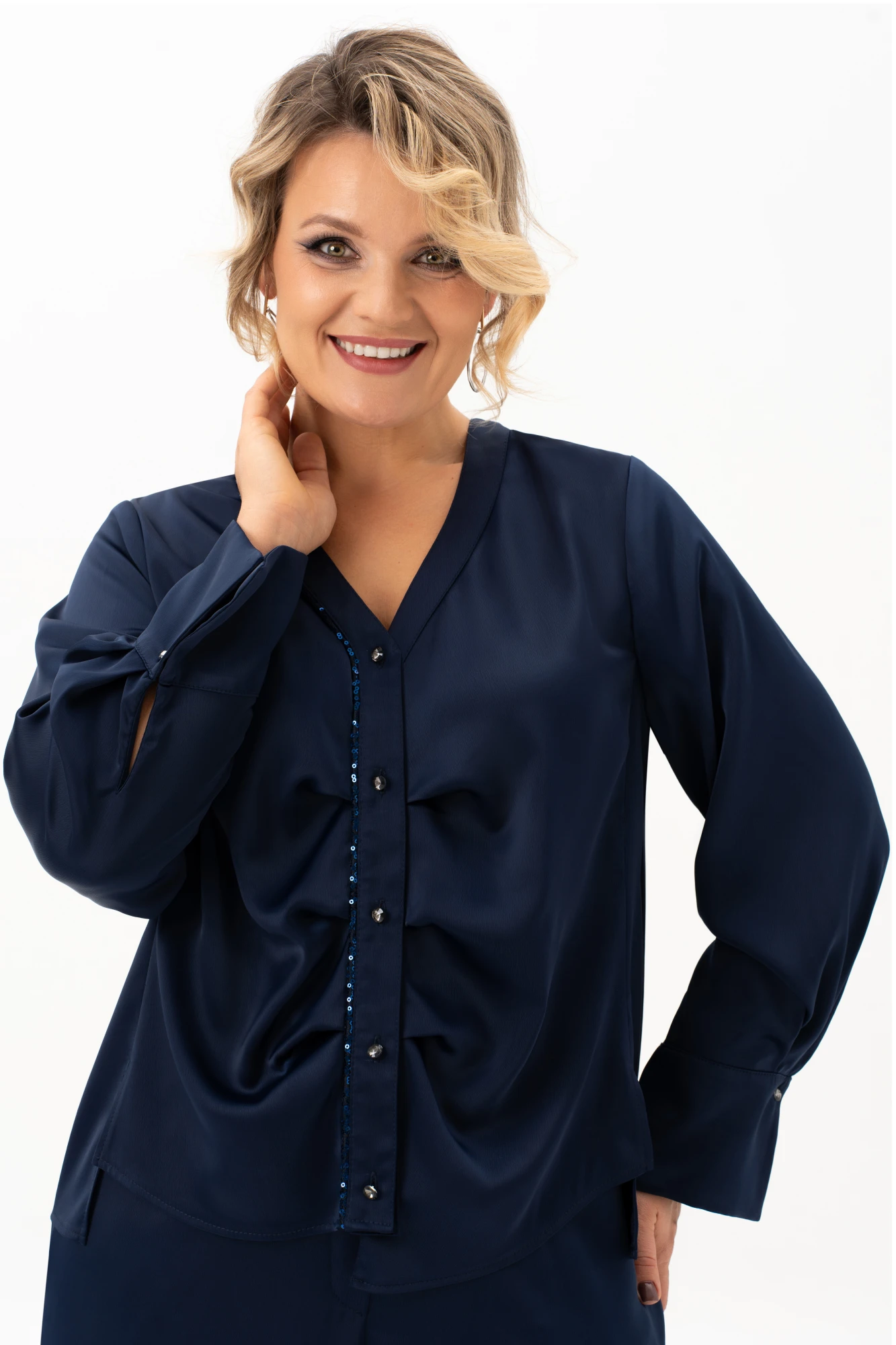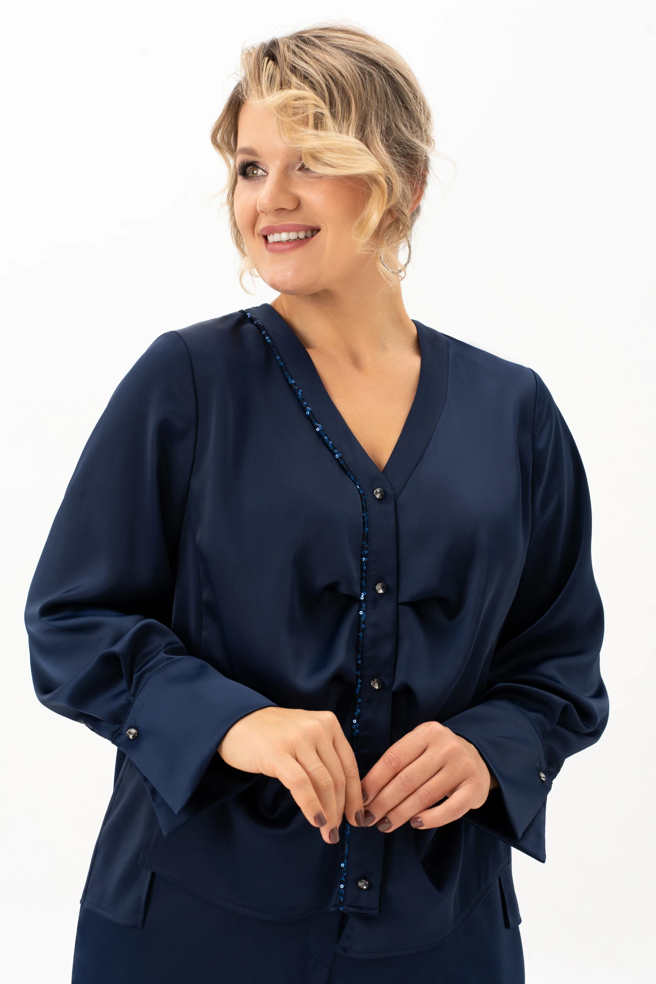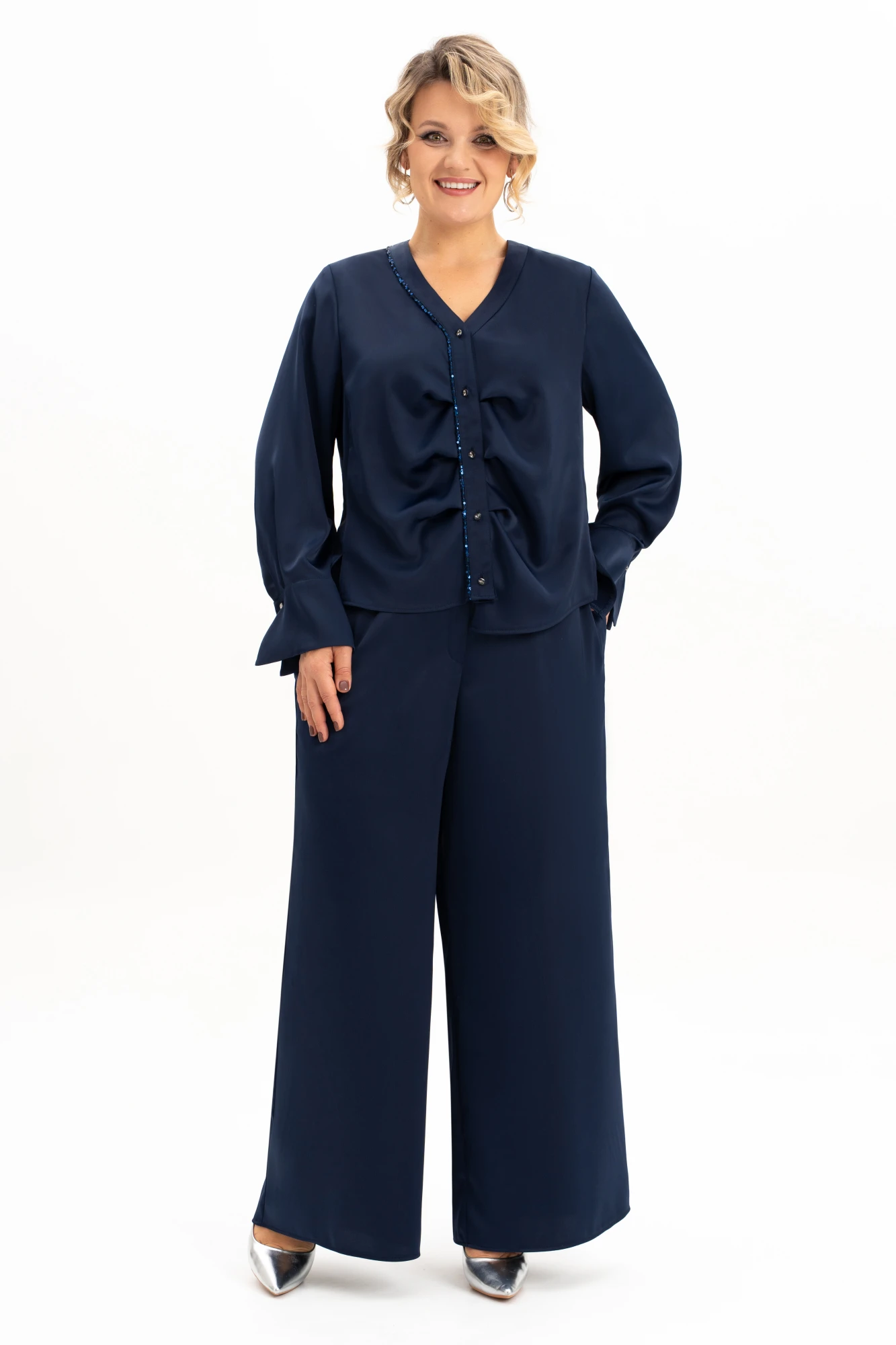 Элегантный женский брючный костюм — настоящая находка для тех, кто ищет идеальный образ на праздник, свадьбу или важный вечер. Классический крой и свободные брюки палаццо подчёркивают достоинства фигуры и дарят комфорт. Нарядный и вечерний стиль — безупречно смотрится на большом мероприятии, создавая образ, полный уверенности и шарма. Блуза выполнена из шелковистой ткани с приятной фактурой. Блузка с длинными струящимися рукавами выглядит очень изящно и очаровательно. Блузка без воротника, застежка на петли и пуговицы по планке, с V – образным вырезом горловины. Спинка с декоративным элементом из паеток. По переду вдоль планок заложены складки и обработан кант из паеток. Изделие асимметрично по низу. Боковые швы перенесены в линию рельфа полочки и спинки. В рельефах полочки обработаны разрезы. Рукав со складкой по шву притачивания манжеты. Прямого силуэта с втачным , длинным рукавом. Брюки с широкими штанинами палаццо выгодно подчеркивают женственные формы, а свободный крой обеспечивает удобство в любой ситуации. На брюках обработаны карманы в боковых швах, по талии пояс с застежкой на молнию и частично на резинке. Красивая двойка строгого силуэта — идеальное сочетание для торжеств и даже для делового офисного дресс кода. Подходит для женщин больших и полных размеров, продуманный крой визуально стройнит, подчёркивает талию и скрывает лишнее. Создайте идеальный образ — выберите стильный женский нарядный костюм с брюками палаццо и подчеркните свою индивидуальность!