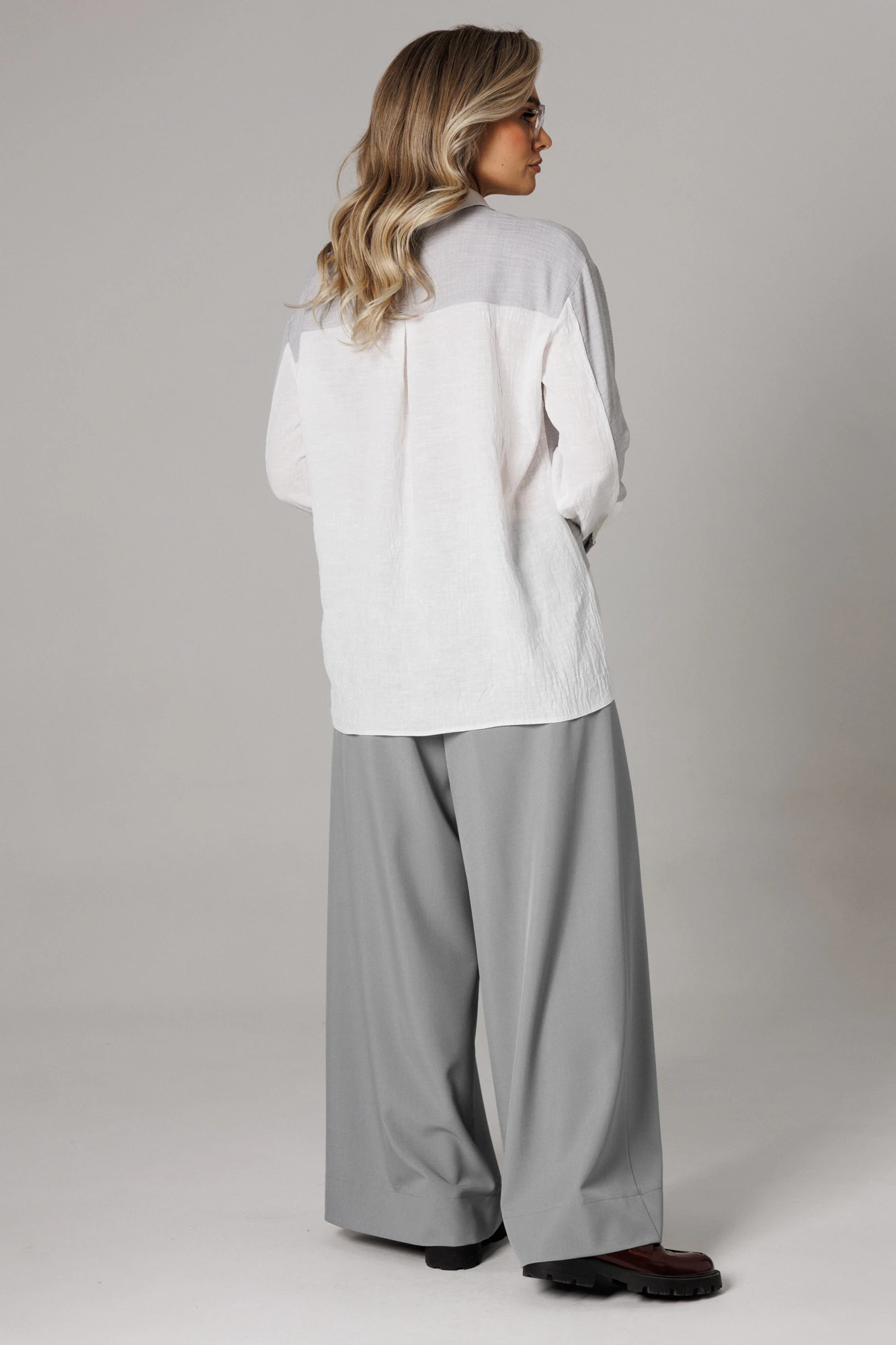 Комплект из костюмной ткани создан для тех, кто ценит комфорт и элегантность в каждой детали. В комплект входит блузка и штаны палаццо. Оверсайз крой придаёт костюму особый шарм и дает свободу движений. Высокая посадка и резинка по поясу подчёркивает талию и делает силуэт более изящным. Благодаря свободному крою костюм подойдёт для разных типов фигуры. Он подчеркнёт вашу индивидупльность. Блузка прямого силуэта, застежка на планку и пуговицы. Воротник на отрезной стойке. По полочке идет ассиметричный подрез со вставками из 2-х видов однотона и разрезом. Плечо спущенное, рукав длинный со вставками, на манжете. По спинке идет кокетка и встречная складка. Брюки полаццо , прямые с односторонней складкой и запахом по центру. По низу брюк широкая подгибка. Пояс на резинке . В качестве декора- брендированная металлическая нашивка по подрезу полочки. Длина по спинке (50-54) - 74 см, (56-60) - 76 см. Длина рукава (с манжетой): (50-54) - 57 см, (56-60)-59см. Длина брюк: (50-54) - 97 см, (56-60) - 98см