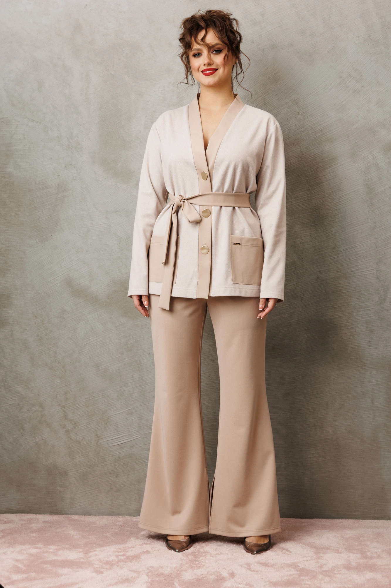 Нежный и комфортный женский комплект в стиле Old money от бренда Anastasia, идеальный для любого случая. Этот комплект сочетает в себе элегантность и комфорт, что делает его подходящим как для деловых встреч или прогулок. Комплект состоит из жакета и брюк. Жакет прямого силуэта. Застежка- планка с пуговицами. По полочке идут накладные карманы. Рукав втачной, одношовный. Подчеркнуть талию можно съемным поясом. В качестве декора- брендированная нашивка на кармане, перекликающаяся с золотыми пуговицами. Стильный комплект отлично подойдет для долгих прогулок или для работы, для офиса. Брюки -клеш, пояс на резинке. По внутреннему срезу по низу идут разрезы. Отдельный части костюма легко будут сочетаться с вещами из Вашего гардероба. Модель можно отнести к стилю кэжуал. Костюм можно носить с туфлями, кроссовками или ботинками. Обязательно добавьте наш бренд в избранное и следите за новинками, распродажами, скидками и акциями! Хороших покупок от «Анастасия».