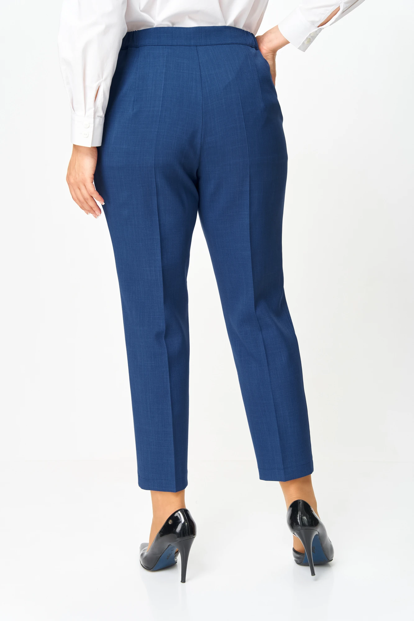 Брюки классические, длиной до косточки, со стрелками. Брюки прилегающие в области бедер и свободные в колене и по низу. По передним половинкам выполнены наклонные карманы, в среднем шве обработана застежка на молнию. По задним половинкам обработаны талиевые вытачки. Брюки на притачном поясе с эластичной тесьмой и застежкой на петлю и пуговицу.