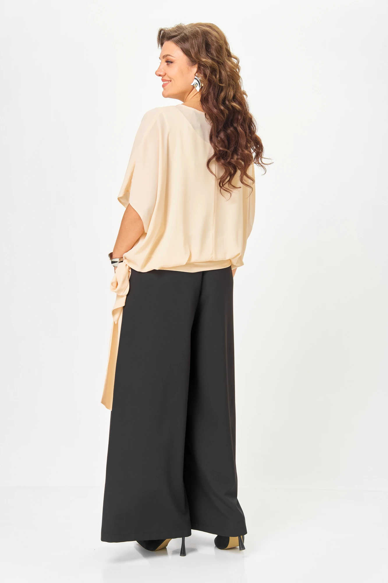 Комплект состоит из блузки топа и брюк. Блузка выполнена из однотонного креп-шифона, топ выполнен из блузочной однотонной ткани, брюки выполнены из однотонной струящейся ткани, контрастной по цвету.