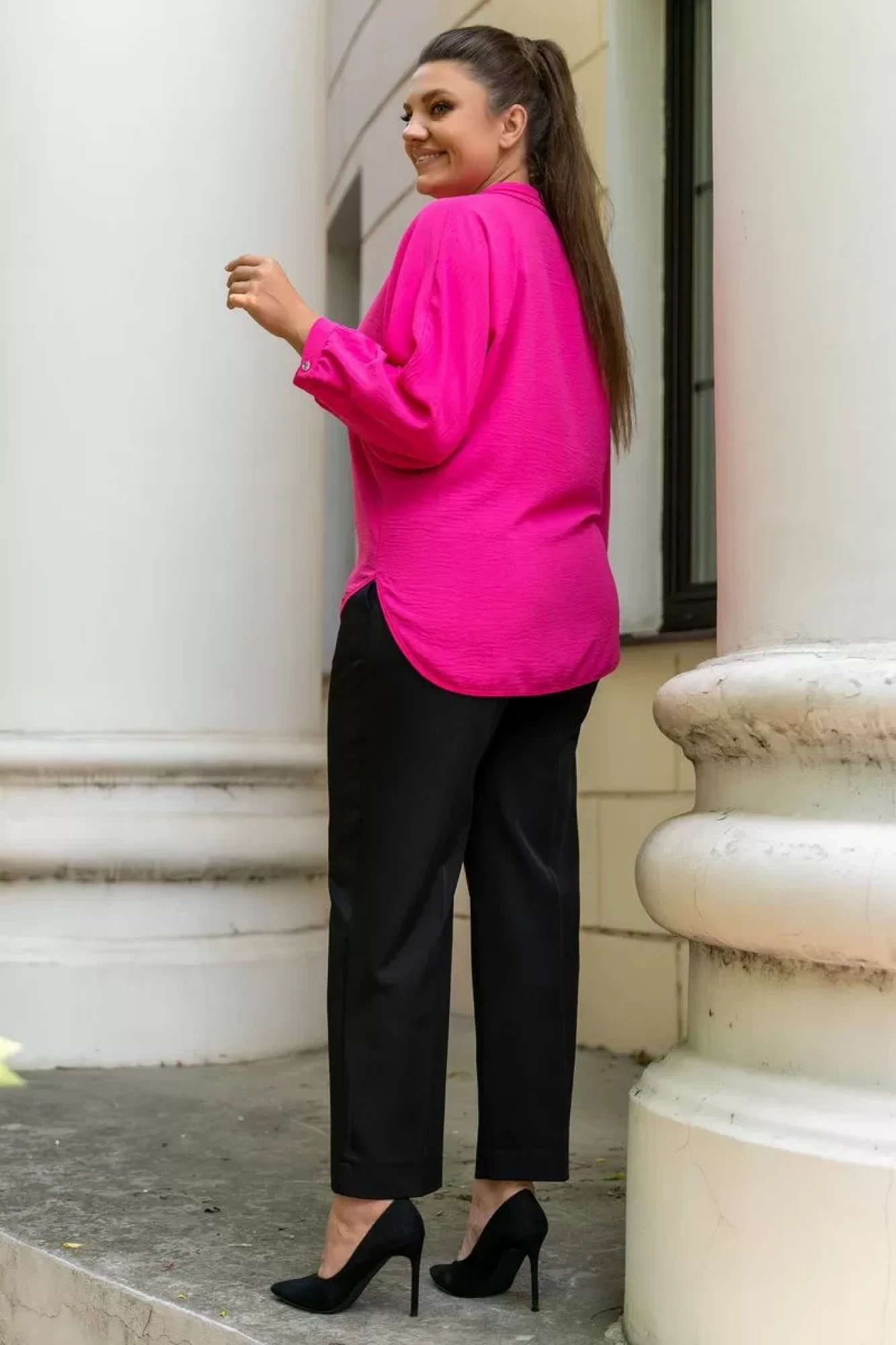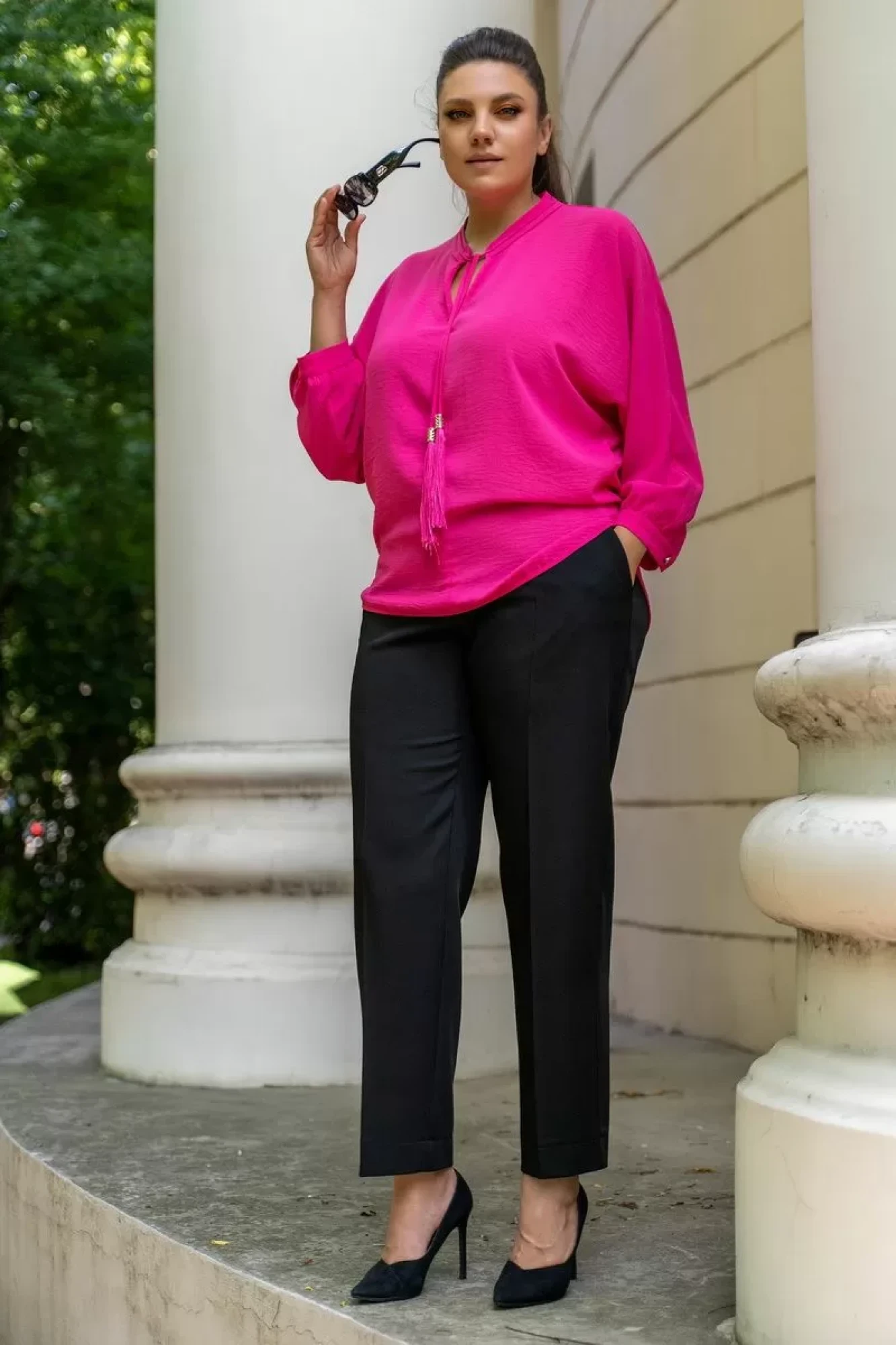 Костюм женский для любого мероприятия. Блузка женская как для праздников, так и для любого повода, покроя "летучая мышь", со стойкой, на которую настрочена завязка с декоративными кисточками из бахромы, со швом по центру полочки, рукава цельнокроёные, застёгивающиеся на петлю и пуговицу. низ блузки по спинке длиннее, по полочке короче. Брюки женские полуприлегающего силуэта на притачной поясе, застёгивающимся на петлю и пуговицу, по переду с центральной застёжкой на тесьму-молнию, с боковыми наклонными карманами, по поясу спинки резинка.