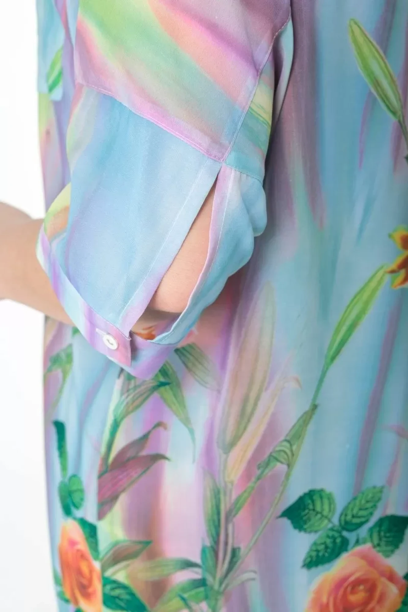Платье-рубашка свободного покроя со спущенными укорочёнными рукавами на манжете с пуговками. Воротник на притачной стойке. Застежка по всей длине на пуговицы. Выполнен из принтованного шифона различных оттенков!