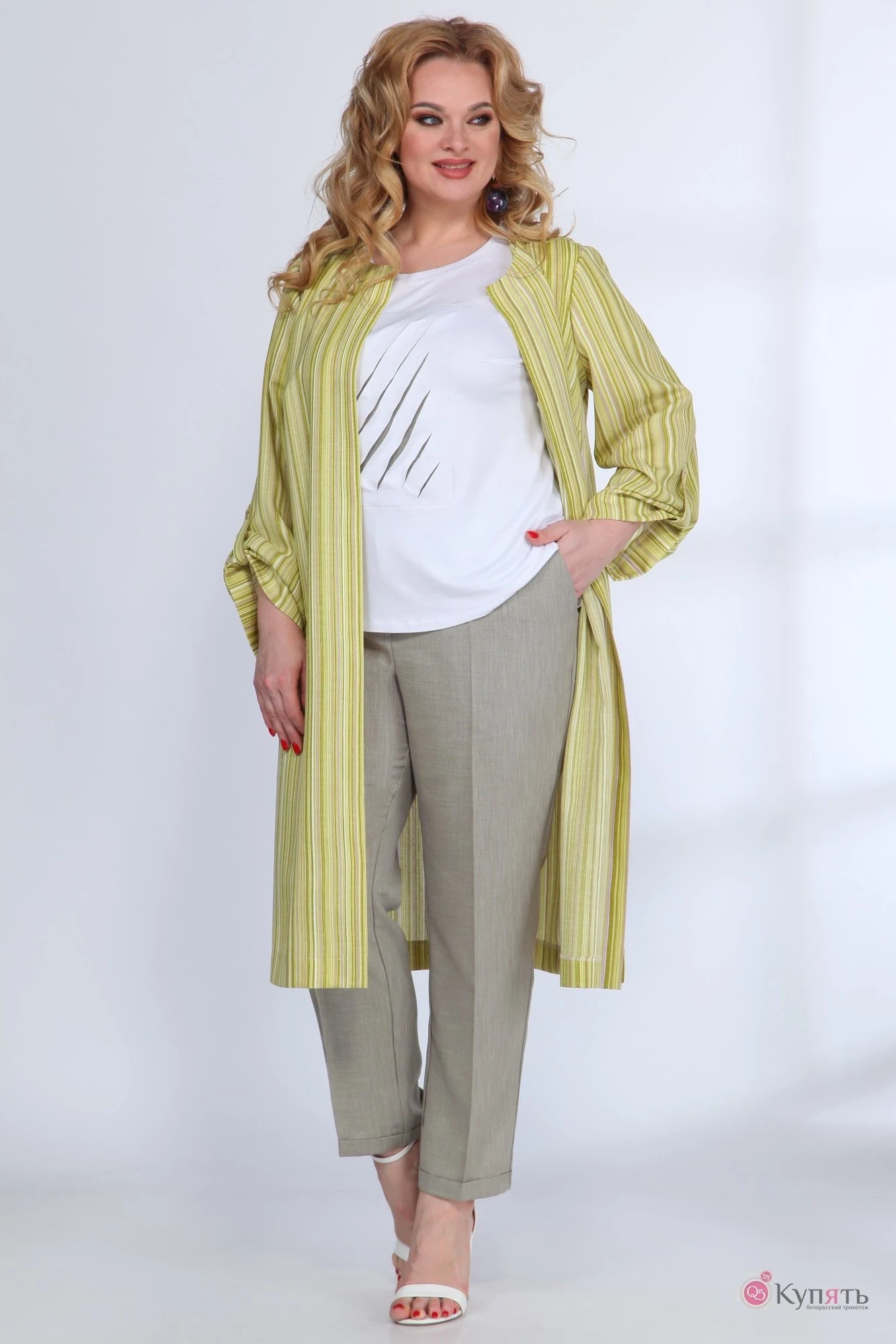 Костюм женский, состоящий из кардигана, брюк и майки. Кардиган прямого силуэта из натуральной ткани. Кардиган без застежки. Горловина полукруглой формы. Рукав длинный втачной, регулируется по длине благодаря пате. Майка полуприлегающего силуэта. По переду майка декорирована стильной аппликацией. Рукав короткий, втачной. Горловина обработани планкой. Брюки классические, слегка укороченные, из "дышащей" летней ткани.В боковых швах расположены функциональные карманы "хулиганы".