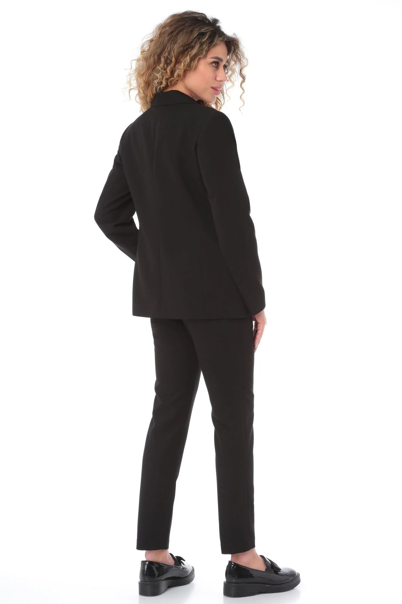 Базовый комплект, состоящий из жакета и брюк, подчеркнет Вашу элегантность и стиль. Подойдет к деловому образу для офиса, учебы и работы. Однобортный жакет полуприталенного силуэта, на подкладке, с плечевыми накладками. Воротник пиджачного типа с отложными лацканами. По переду центральная застежка на петли и пуговицы и прорезные карманы с клапаном, талиевые вытачки и рельефы. Низ бортов закругленной формы. Спинка со средним швом и рельефами. Рукав втачной двухшовный длинный. Брюки прямого кроя, слегка зауженные книзу, с высокой талией на притачном поясе с застежкой на пуговицу. По задним половинкам собраны на эластичную тесьму, которая делает их максимально удобными для любых размеров. Передние половинки с наклонными карманами и застежкой на молнию в среднем шве. На задних половинках вытачки.