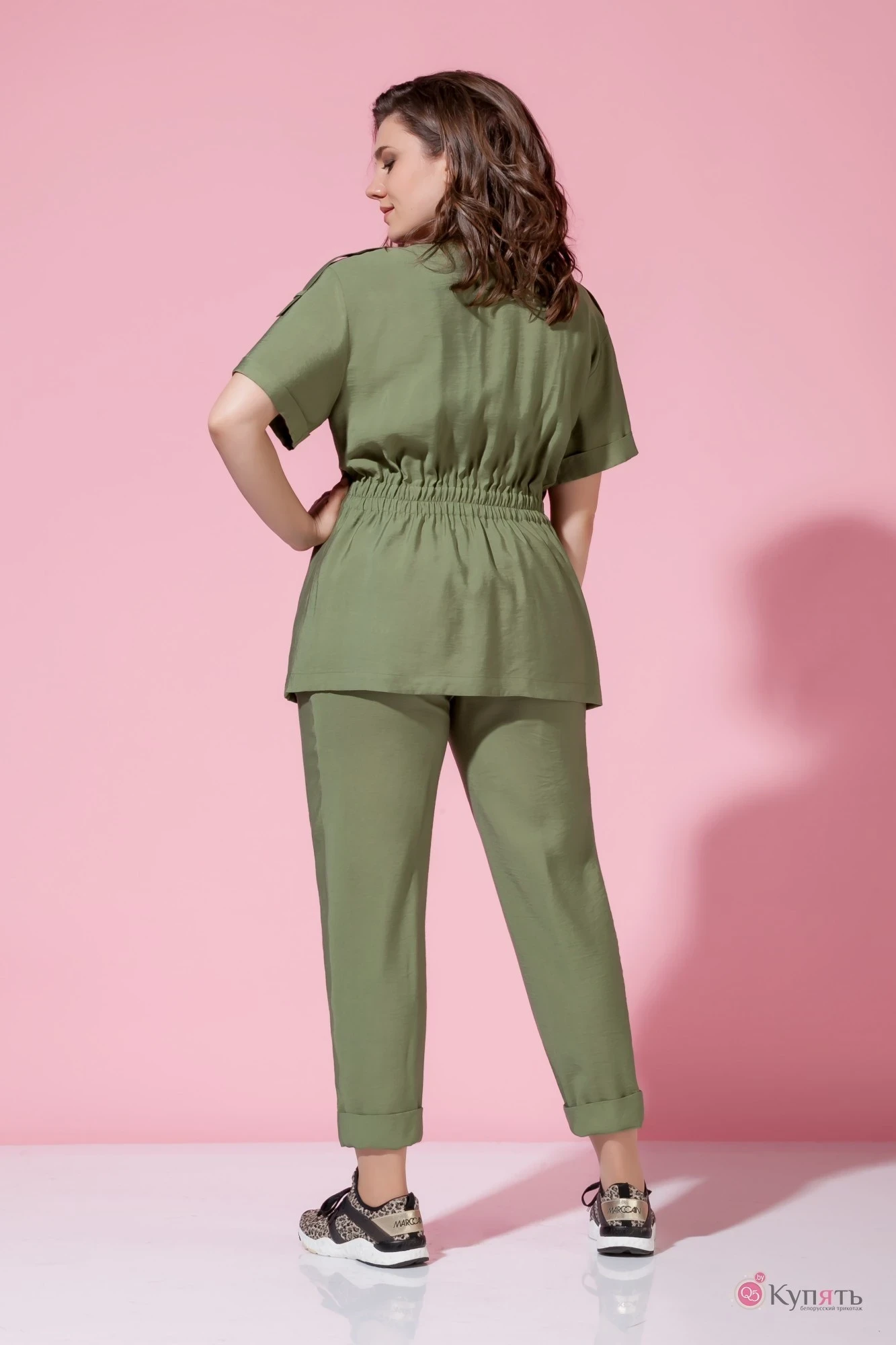 Женский жакет из костюмной ткани прямого силуэта с центральной потайной застежкой на петли и пуговицы. Горловина округлой формы. Линия плеча спущена, рукав короткий с манжетой, по переду обработаны накладные карманы и пояс на кулисе, спинка по линии талии на резинке. Брюки прямого кроя с 2 складками от пояса и с наклонными карманами, сзади карманы-листочки.